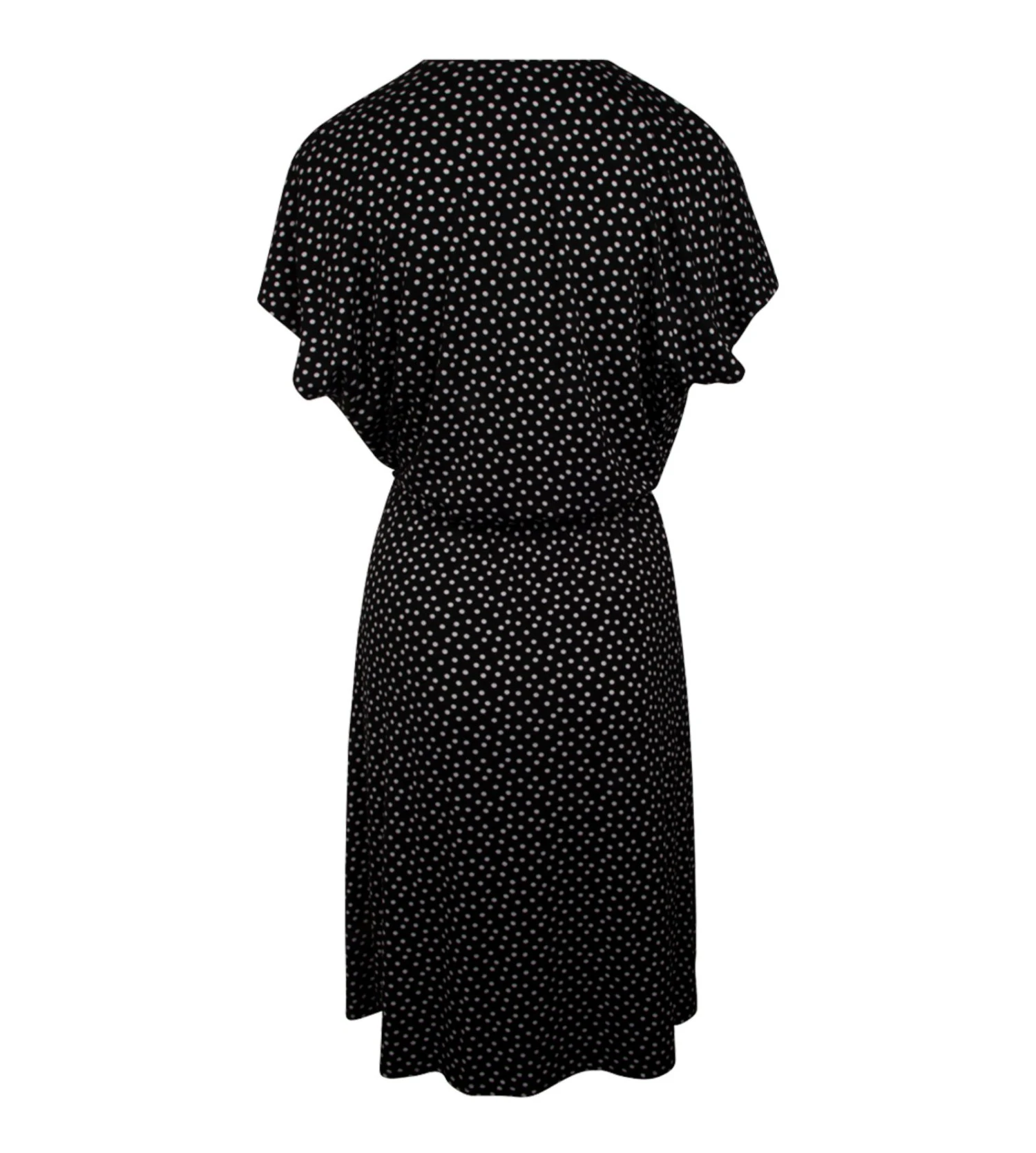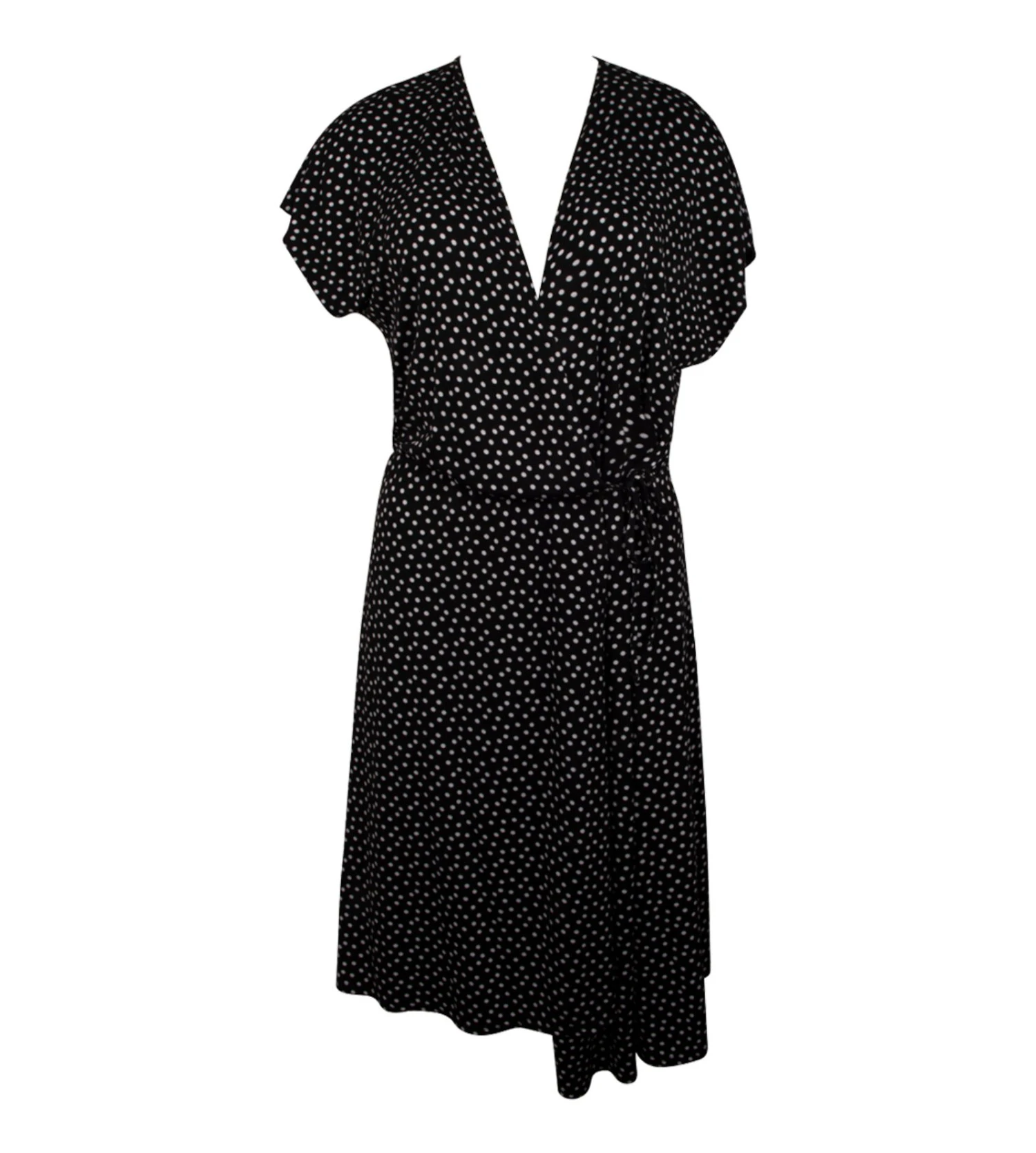 Sa maille noire fluide est délicatement rehaussée de finitions à pois contrastés, offrant un look chic et intemporel. Sa coupe cache-coeur avec son décolleté plongeant et ses manches courtes fluides sublime toutes les silhouettes avec légèreté.