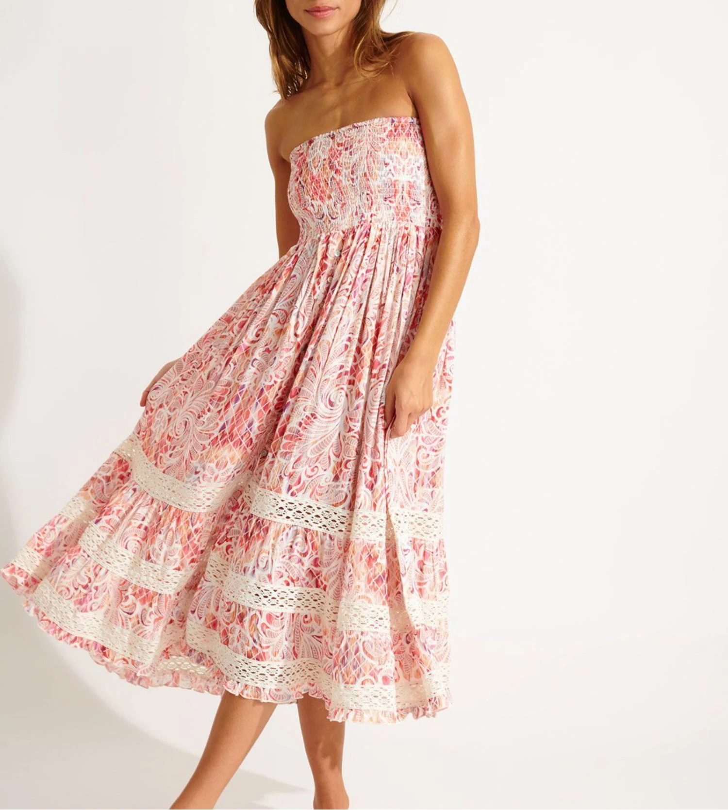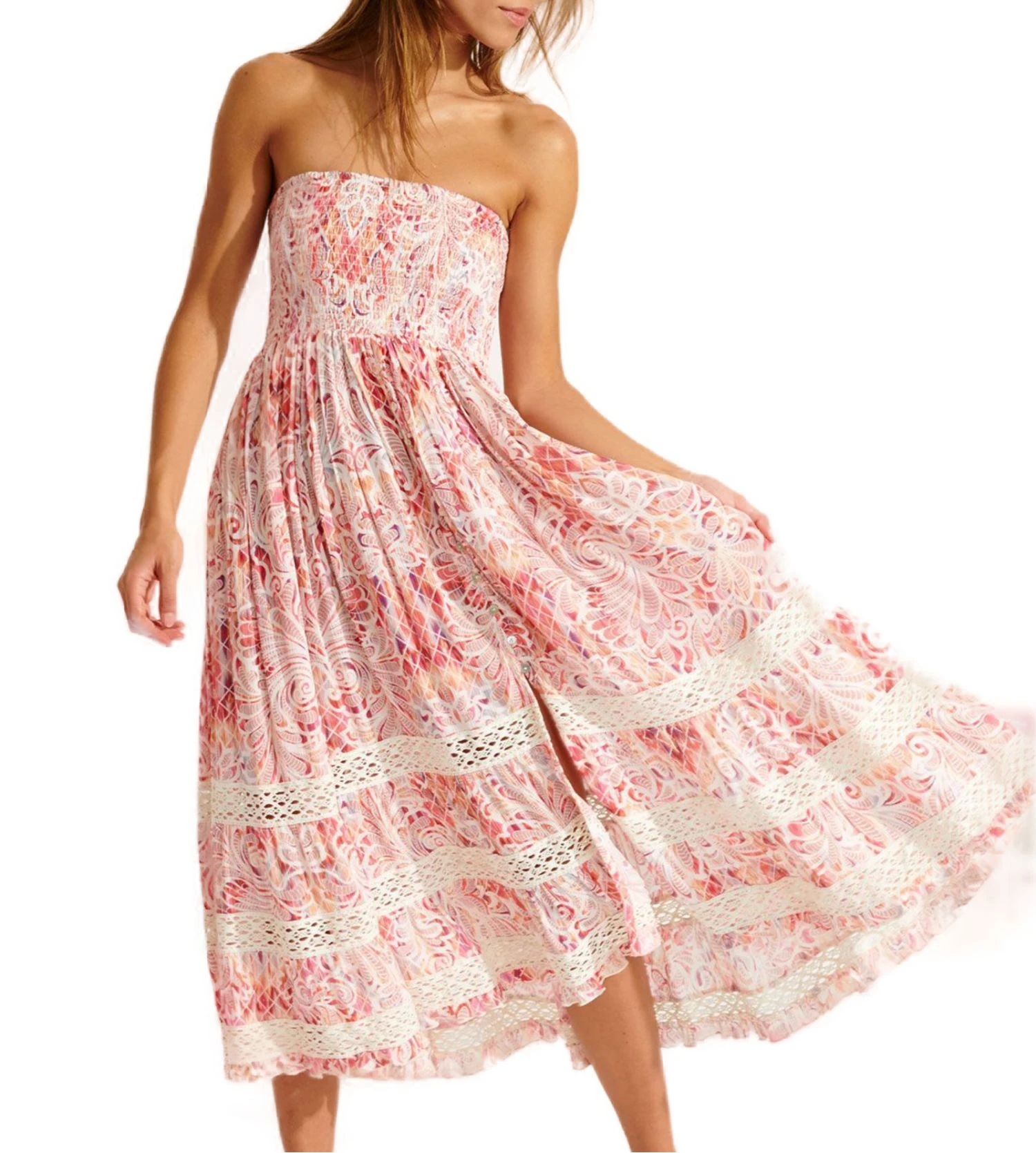 Adoptez un look bohème et polyvalent cet été avec la robe longue ETHEL FLOWERVIBE de la marque Banana Moon. Sa conception ingénieuse 2-en-1 vous permet de passer d’une robe bustier élégante à une jupe longue fluide en un instant.