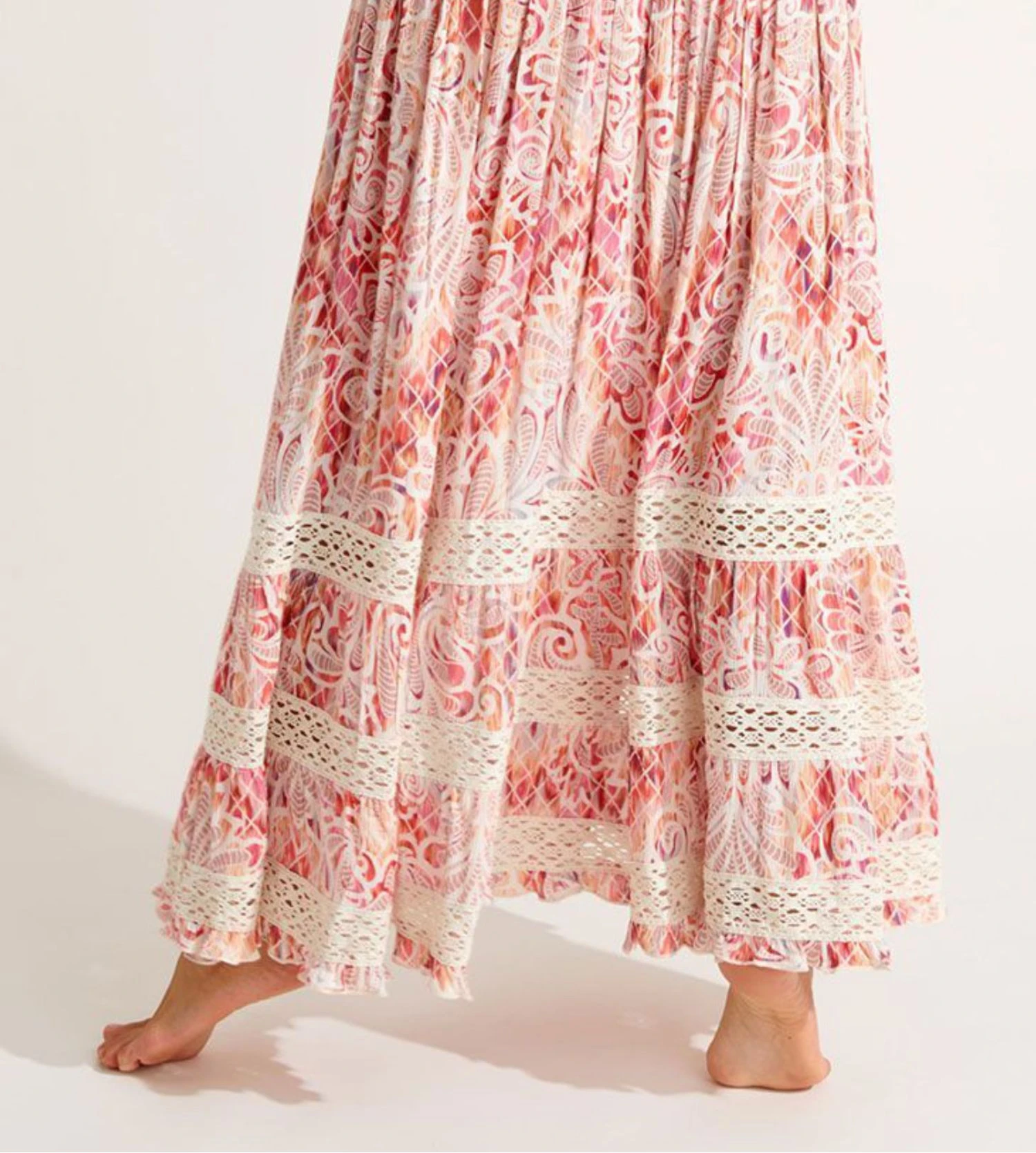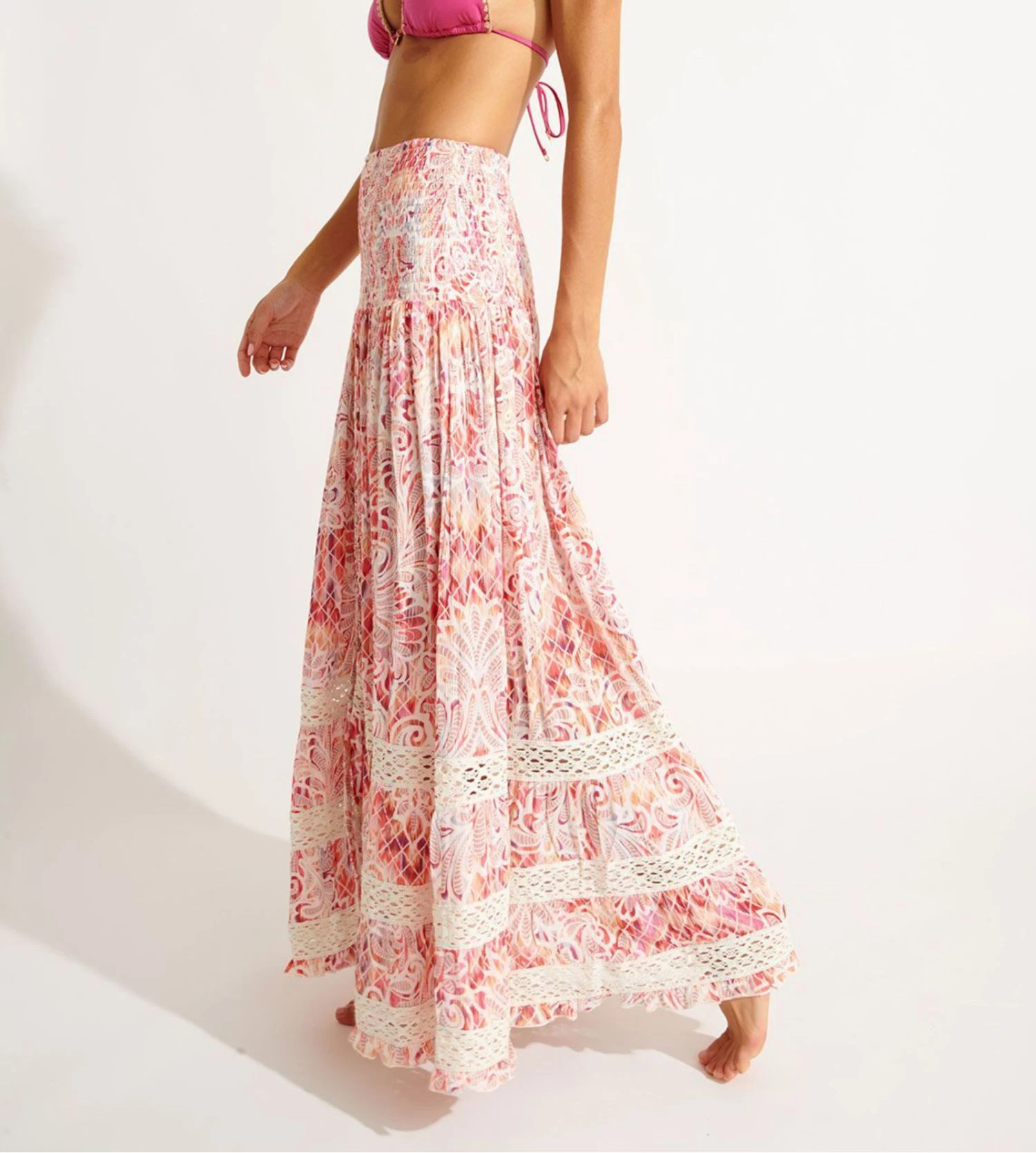 Arborant un imprimé floral vibrant sur un fond rose éclatant, cette pièce capture l’essence des journées ensoleillées. Le bas de la jupe est magnifié par trois bandes blanches en crochet, apportant une touche artisanale et raffinée à votre tenue de plage.