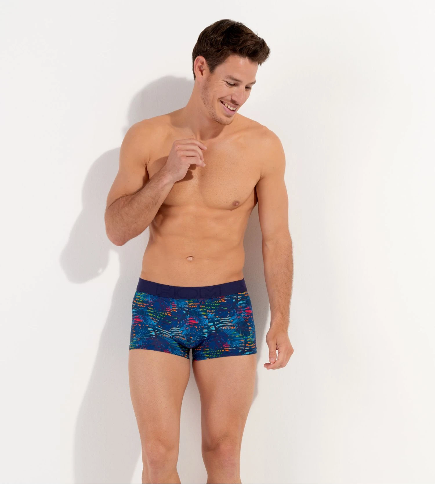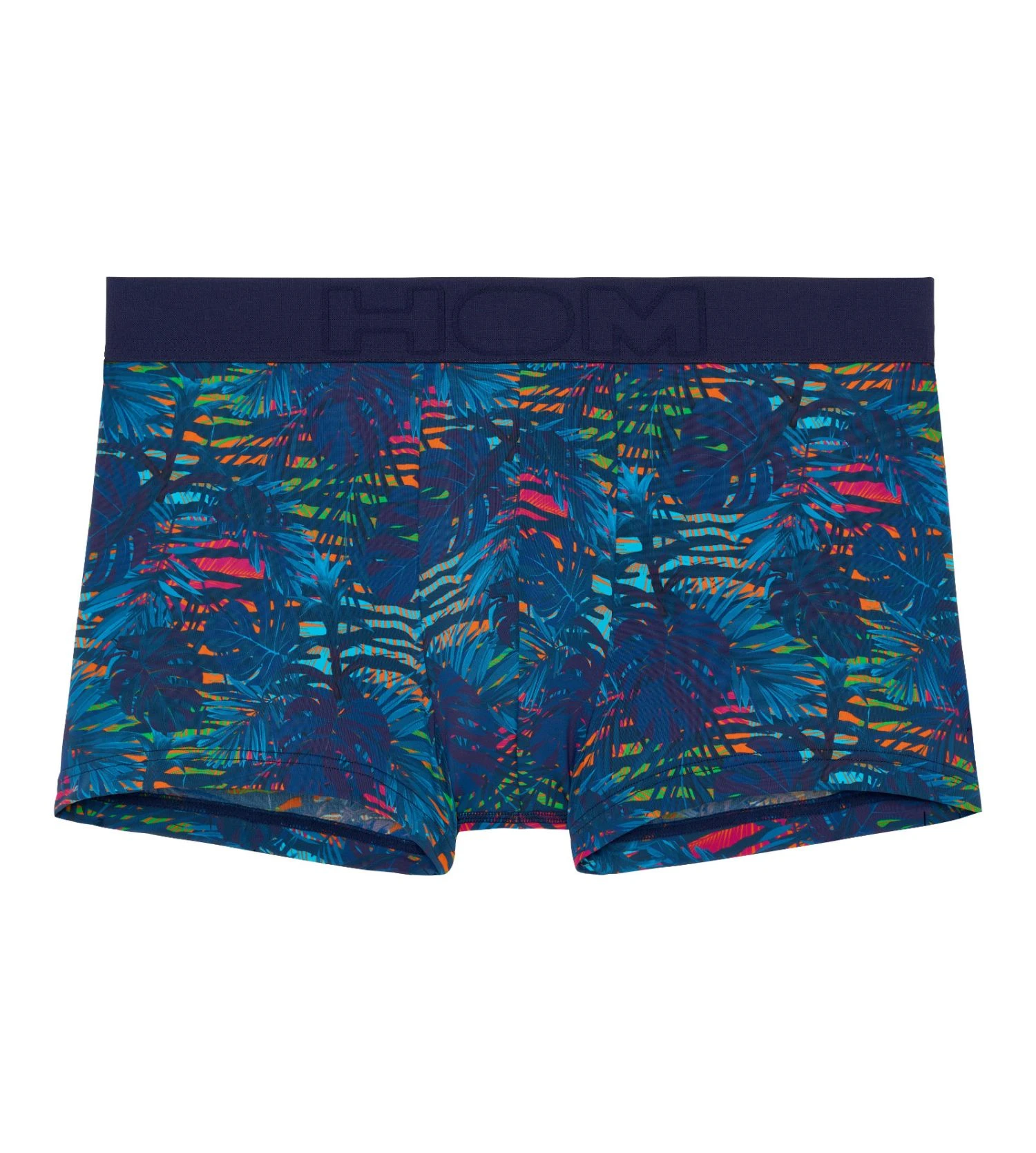 Ce modèle se distingue par son imprimé floral exclusif « Dreamland » aux nuances contrastées sur un fond bleu marine profond. Sa coupe ergonomique et sa ceinture élastique douce, arborant le logo HOM discrètement tissé, assurent une silhouette moderne et un maintien parfait.
