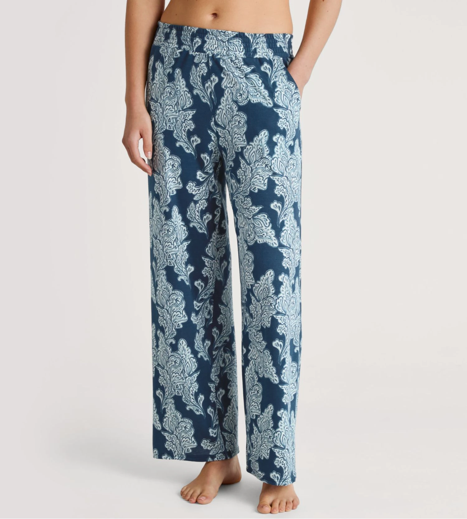 Le pantalon d’intérieur Calida de la collection Favourites Botanic se pare de l’imprimé ‘Deep Dive Petrol’, un motif floral artistique mêlant des touches d’orange et de blanc sur un fond bleu pétrole profond. Conçu dans un mélange de coton et modal de haute qualité, il offre une sensation de légèreté et une fluidité parfaite pour la maison.