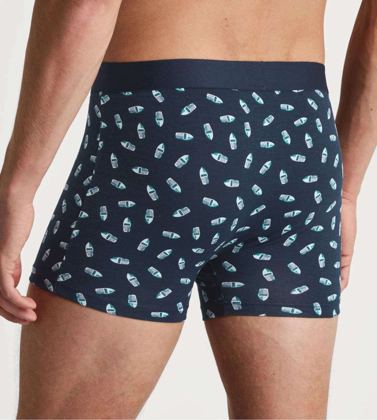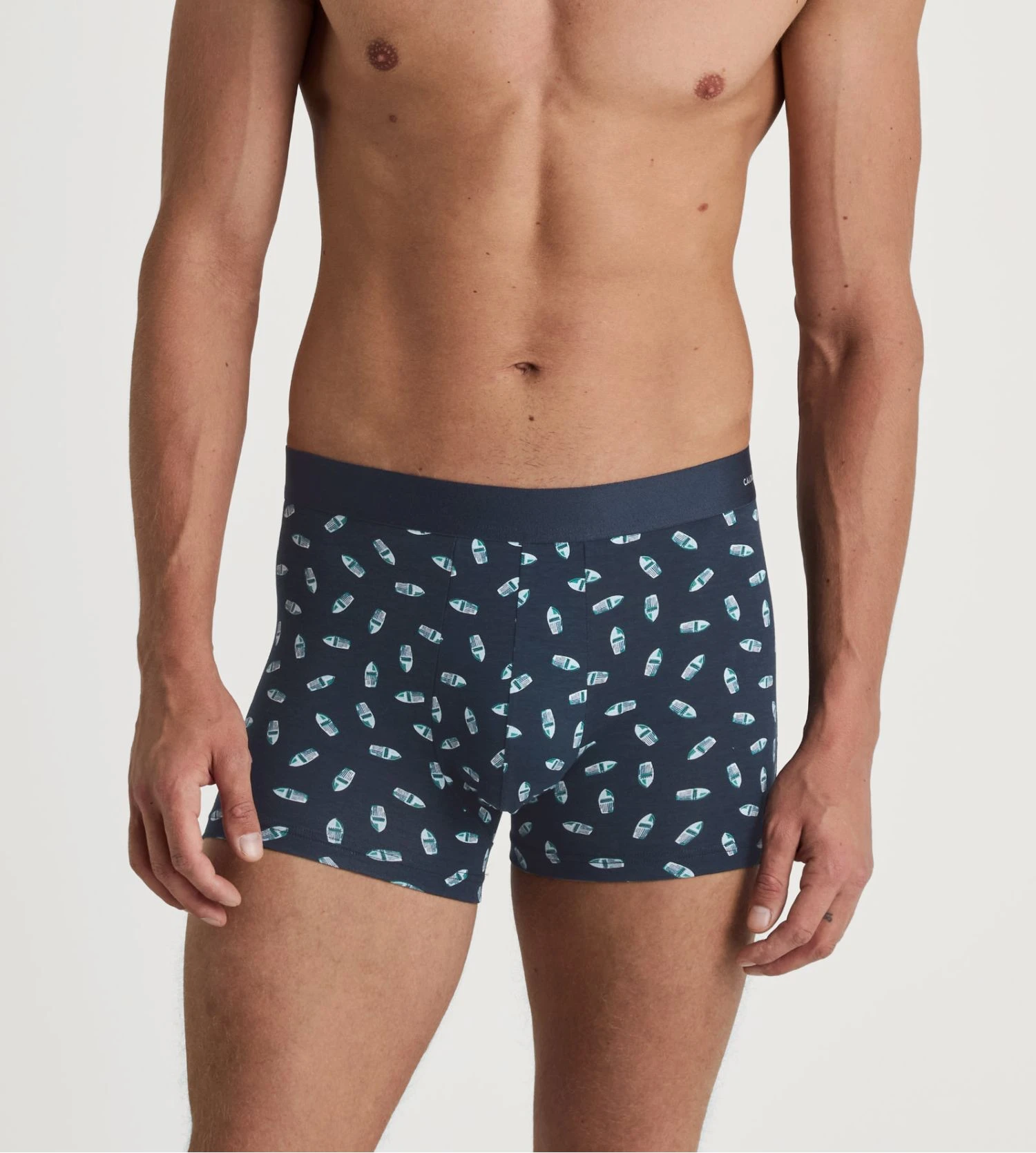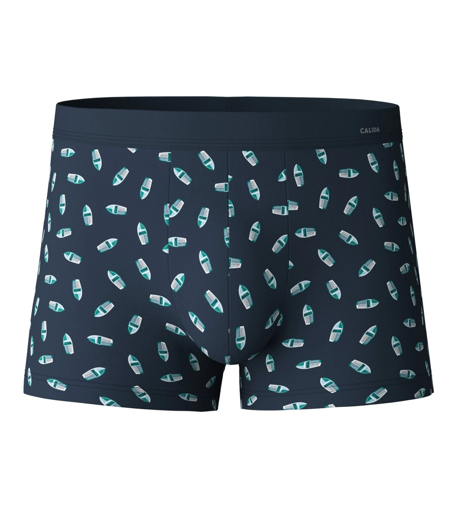 Détails Visuels : Ce modèle se pare d’un coloris « Pond Green » (un vert d’eau profond et sophistiqué) sublimé par un imprimé graphique blanc en nid d’abeille ou maillons géométriques. La ceinture élastique assortie en vert arbore le logo CALIDA en lettres blanches contrastées, apportant une touche signature discrète et haut de gamme.