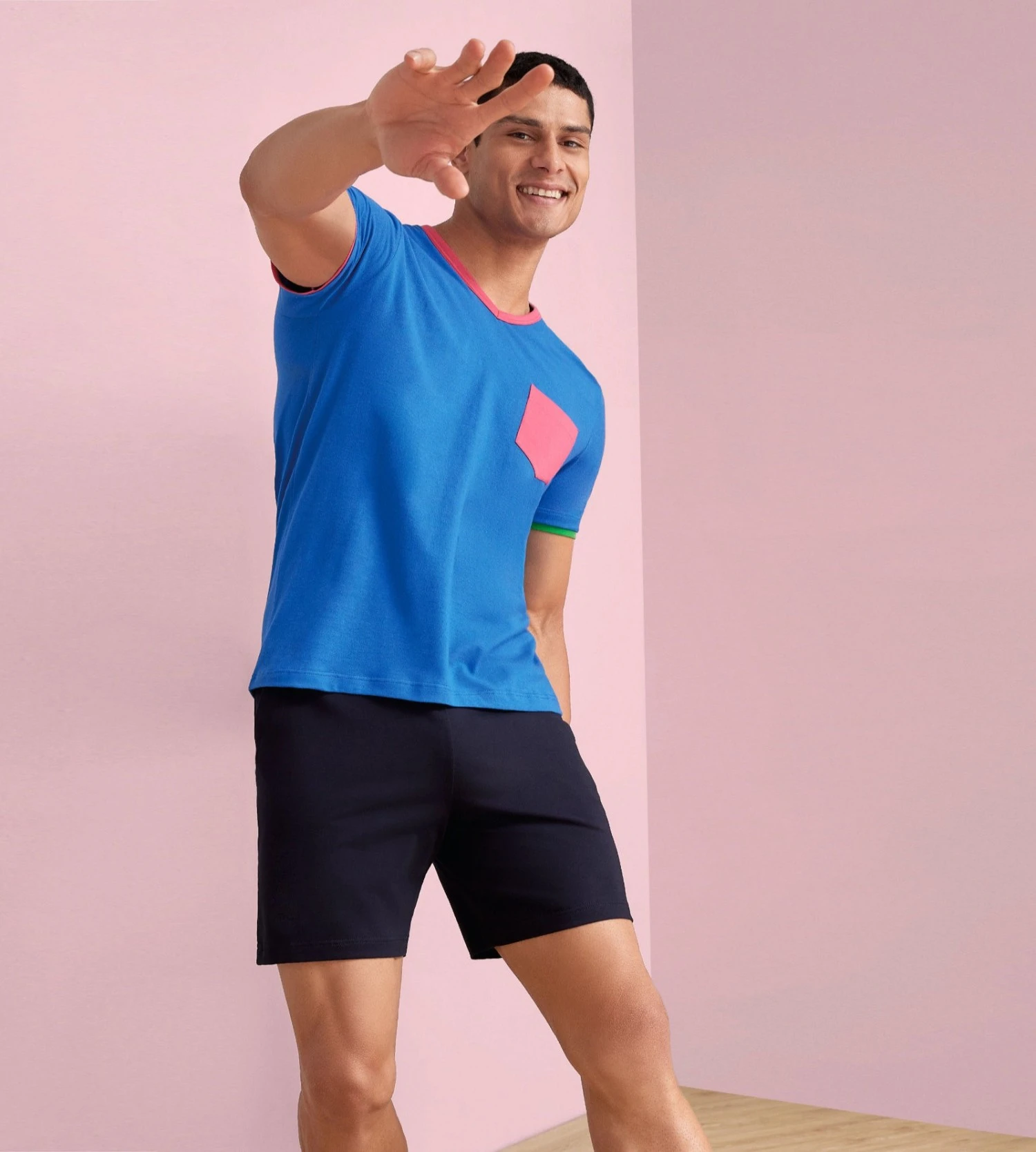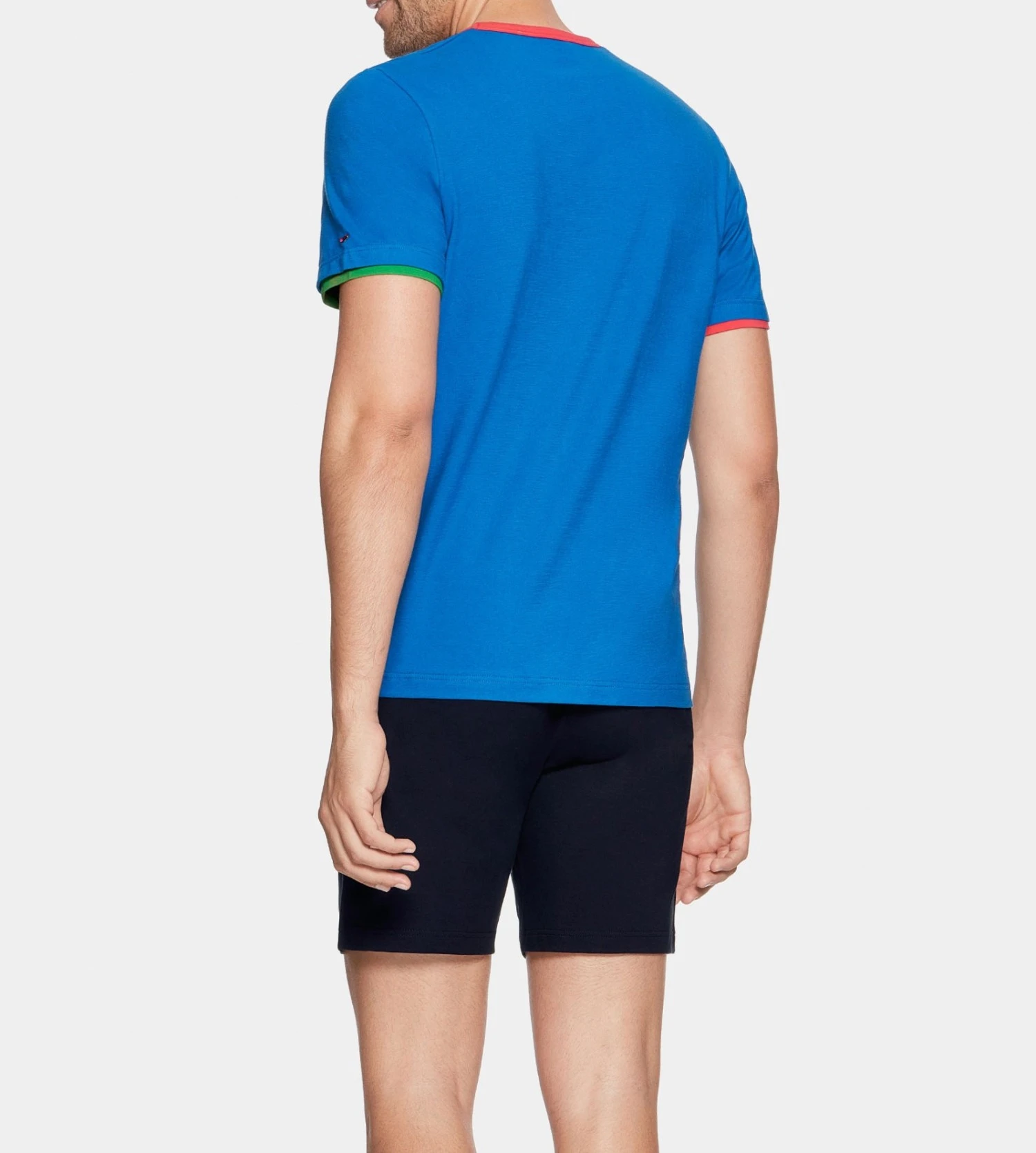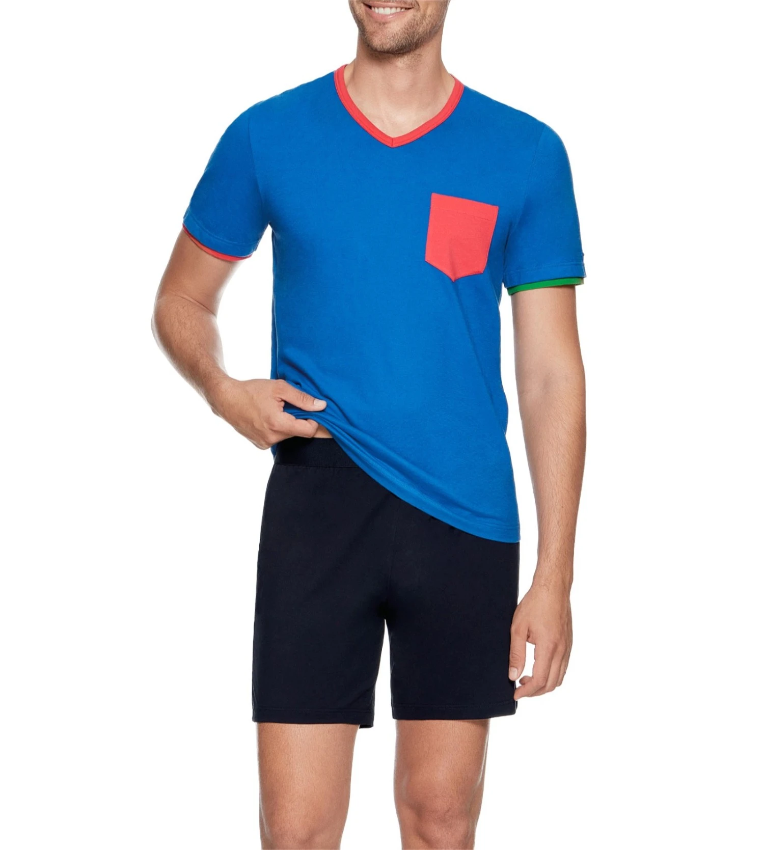 Ce modèle Victoria se distingue par son t-shirt tricolore à la maille épaisse et douce, arborant un col V élégamment fini et une poche poitrine fonctionnelle. Le bas se compose d’un short uni parfaitement coordonné, doté d’une ceinture large et confortable inspirée du savoir-faire de la marque en sous-vêtements.