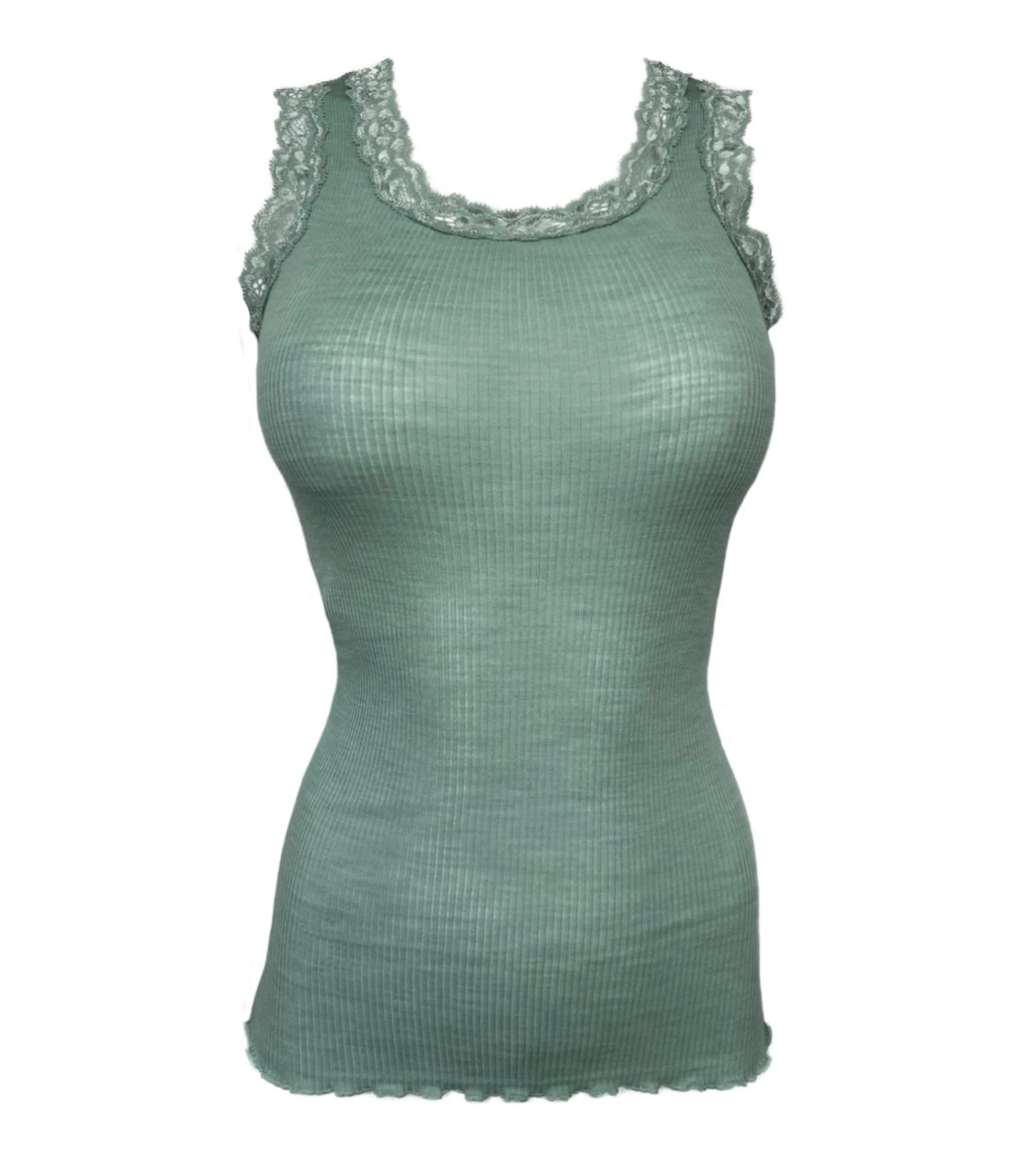 Ce débardeur sophistiqué se distingue par son empiècement en dentelle délicate qui habille élégamment le col et les épaules. Sa maille côtelée ultra-fine offre une silhouette ajustée, tandis que l’ourlet bas travaillé en ondulations apporte une finition féminine et soignée.