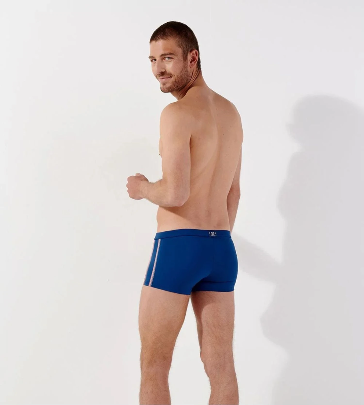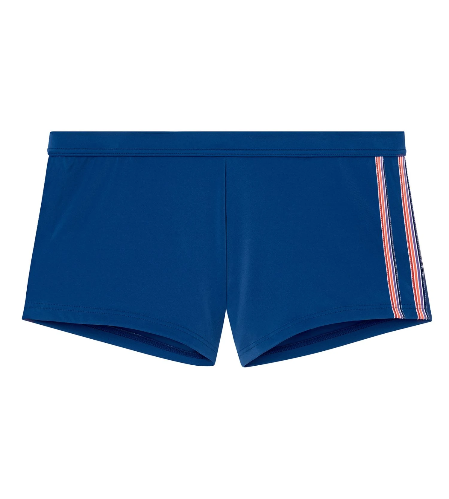 Ce maillot de bain pour homme se distingue par sa teinte bleu marine profonde, rehaussée par des bandes élastiques contrastées cousues sur les côtés qui sculptent une silhouette athlétique. Sa ceinture fine élastiquée offre un confort supérieur et un maintien fiable pour toutes vos activités nautiques, de la natation au beach-volley.