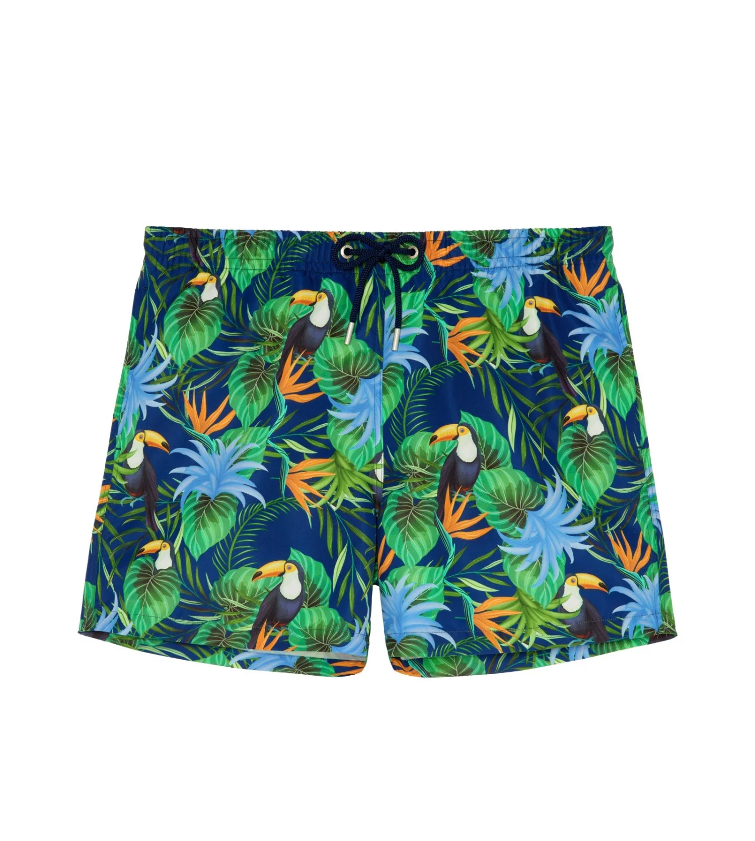Ce maillot de bain pour homme se distingue par son imprimé tropical vibrant mettant en scène des toucans colorés sur un fond bleu marine élégant. Conçu pour allier esthétique et performance, il offre une coupe moderne et un confort inégalé pour toutes vos activités aquatiques, de la mer à la piscine.