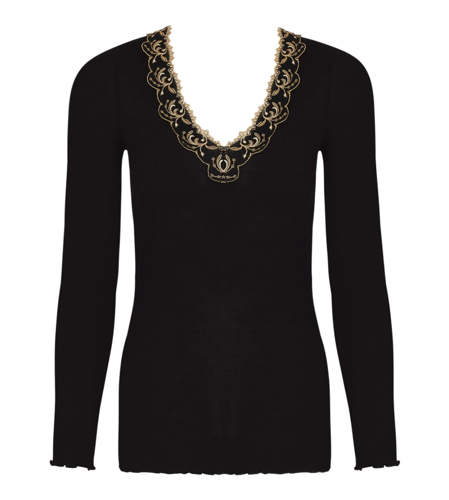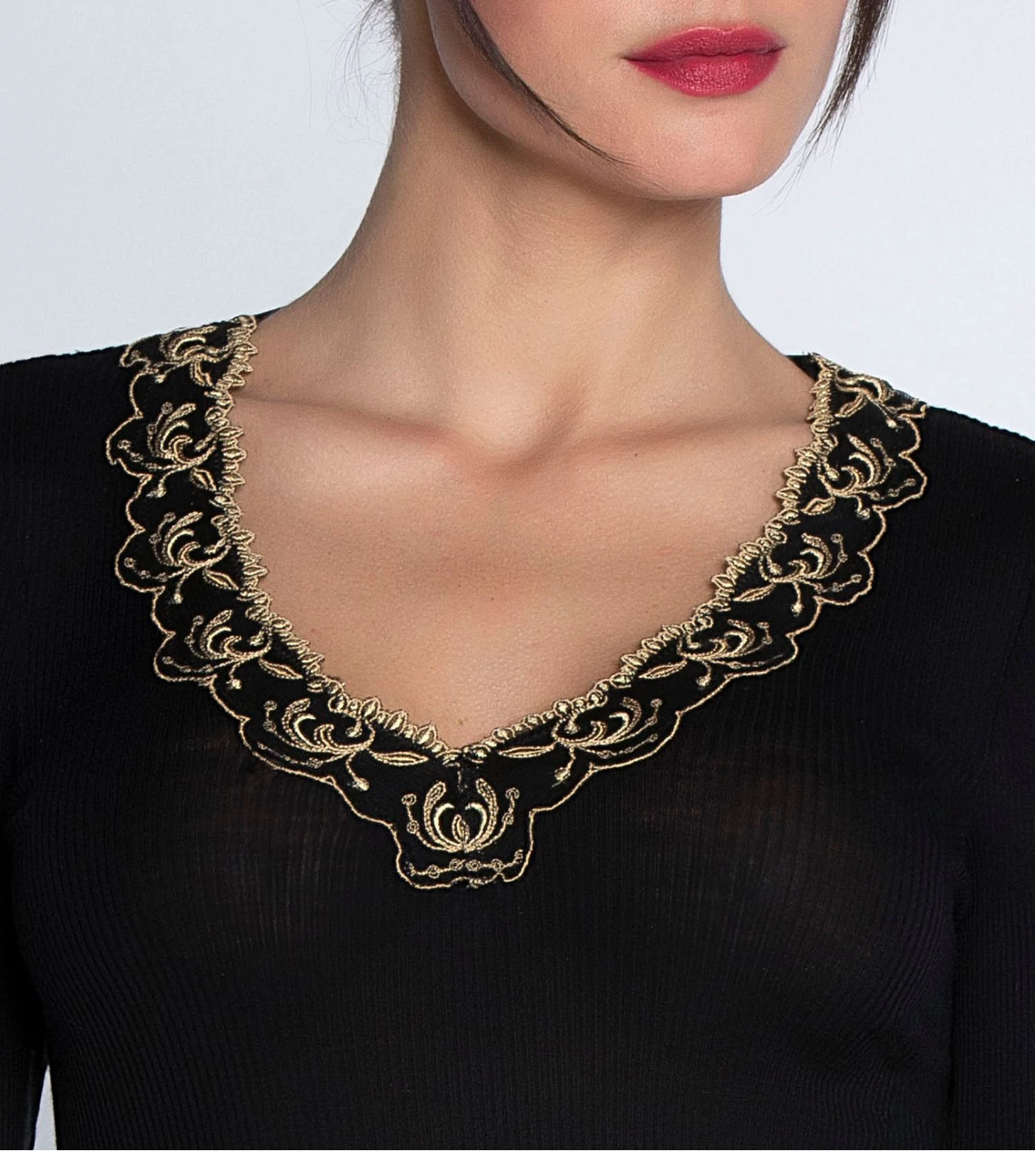 Détails Visuels : Ce modèle se pare du coloris exclusif ‘Or Nuit’, une nuance sombre et profonde magnifiée par une broderie florale délicate. Les fils satinés de la broderie festonnée soulignent le décolleté en V avec un éclat subtil, tandis que la maille tubulaire côtelée offre une texture riche et une silhouette parfaitement ajustée.