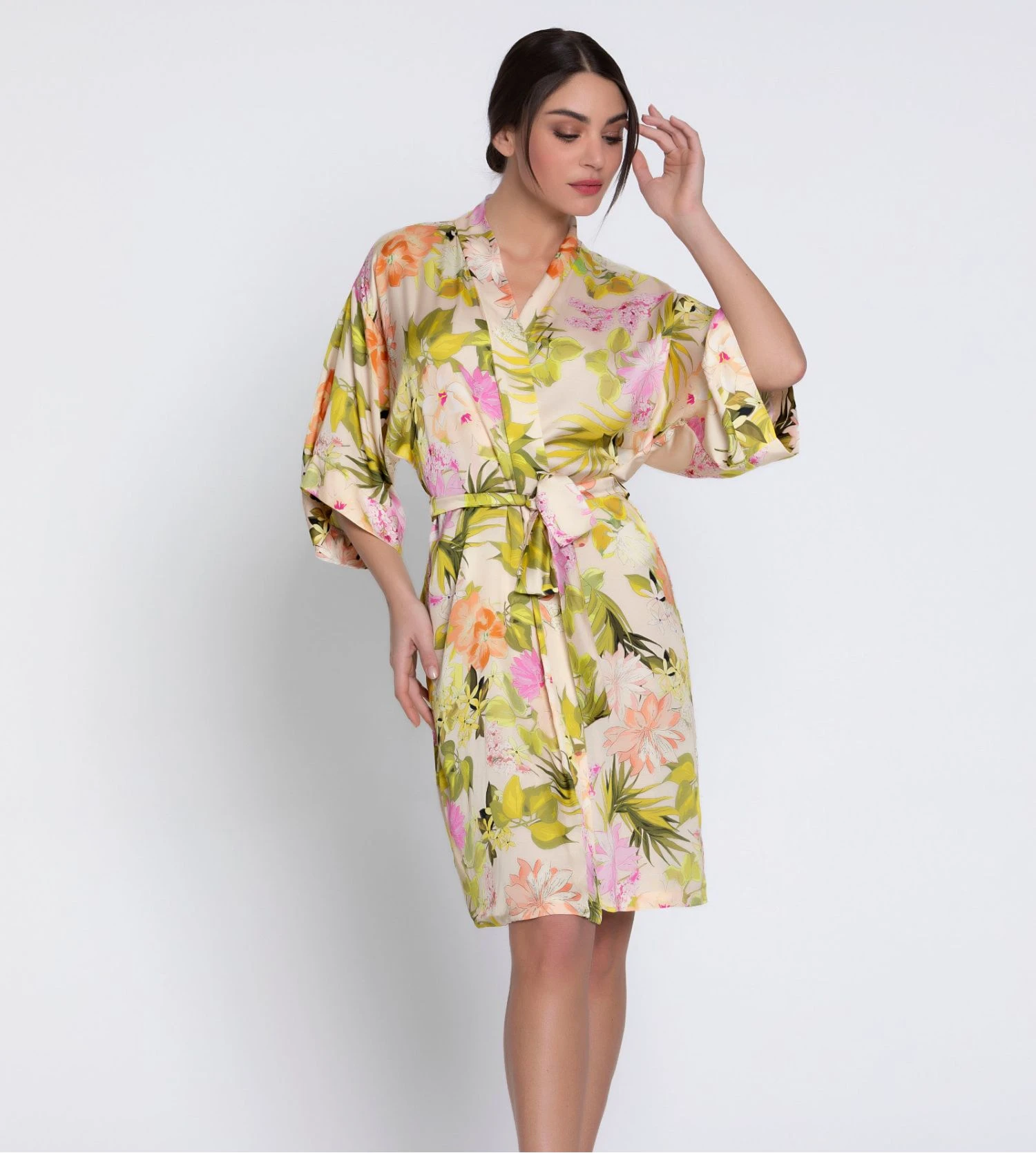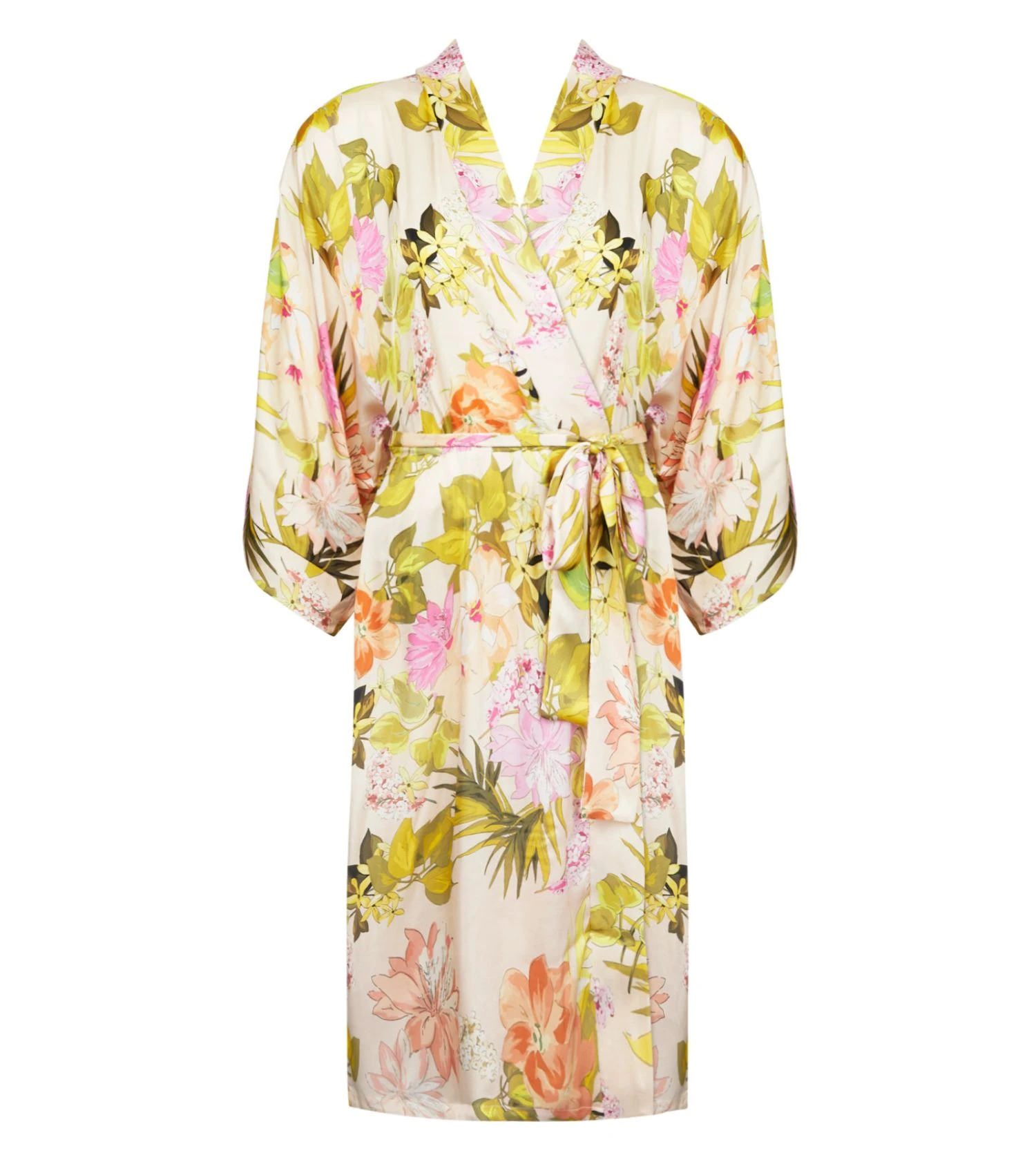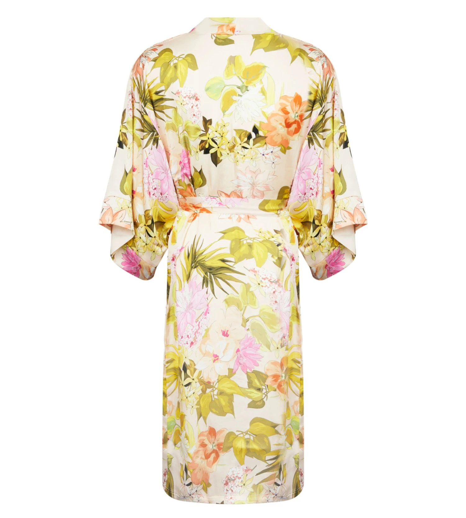 Le coloris Or Rose est sublimé par un imprimé floral aux nuances acidulées, évoquant la lumière d’un jardin d’été. Ses manches 3/4 évasées apportent une touche de modernité tandis que la ceinture amovible permet de souligner la taille selon vos envies.