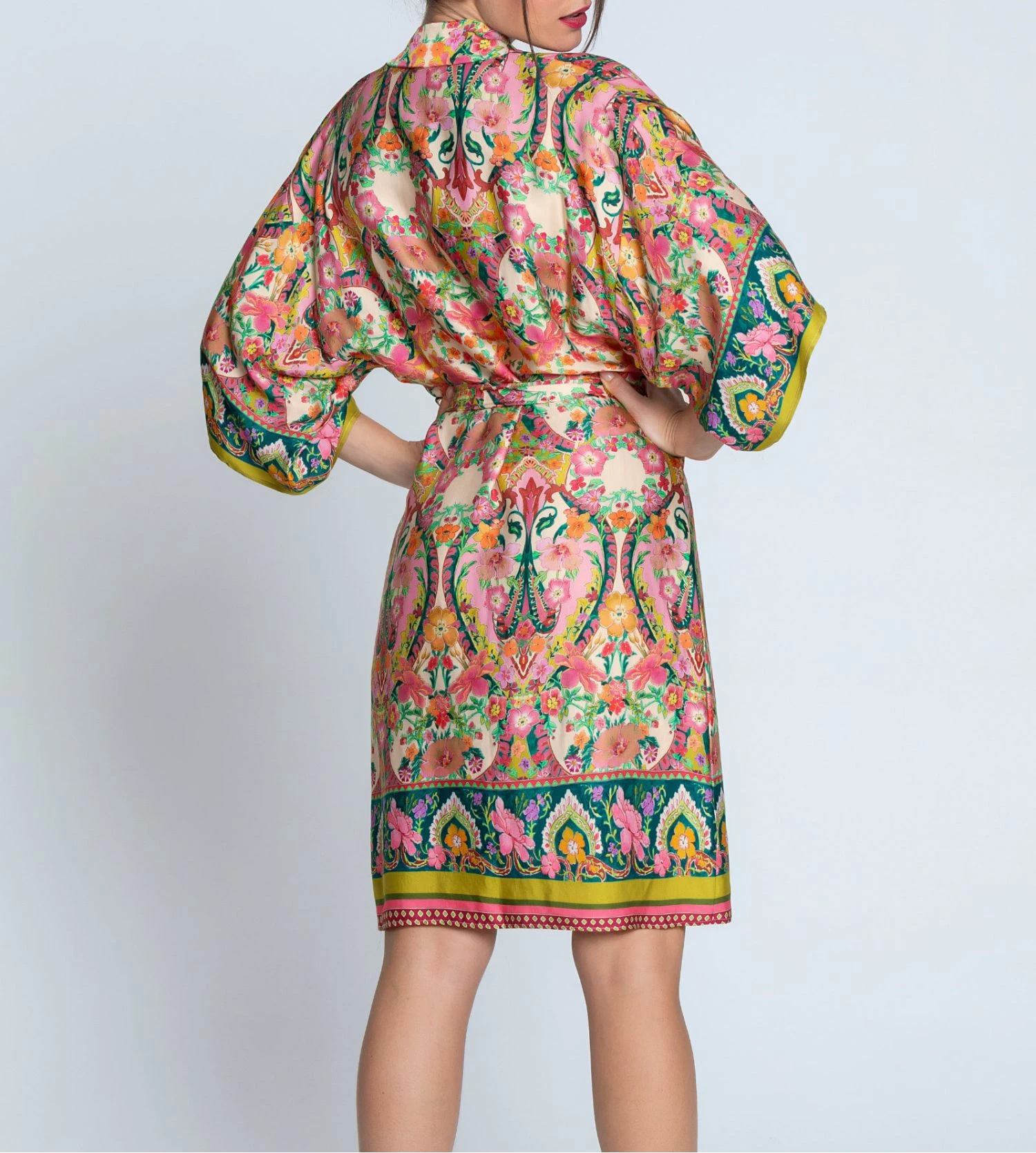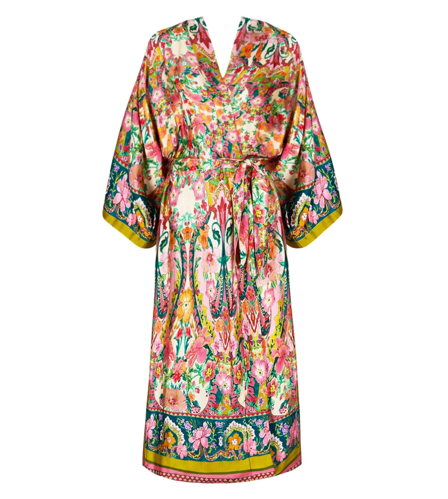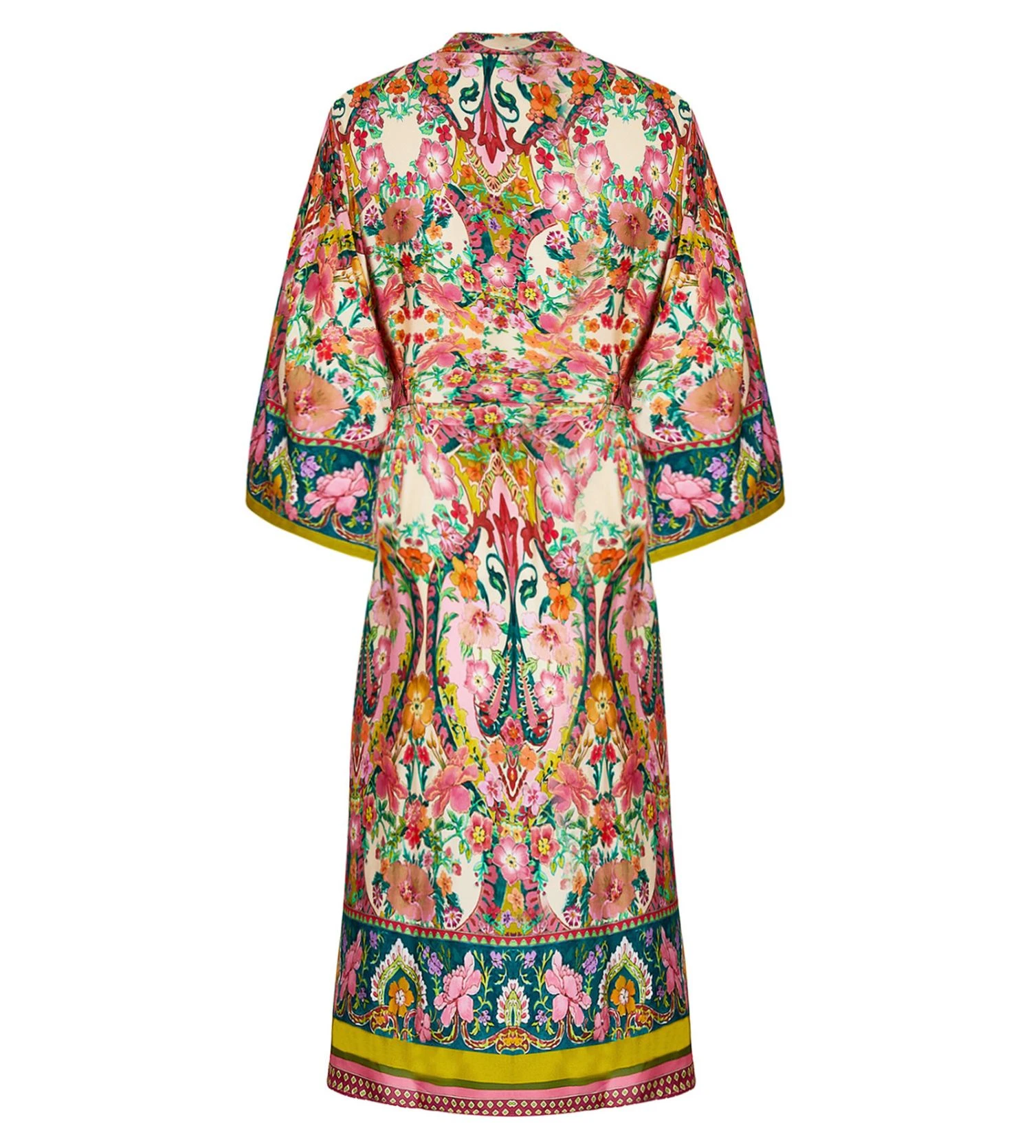 Le déshabillé kimono de la collection Libertine en Fleurs est une véritable invitation au voyage sensoriel. Conçu dans un satin de viscose d’une douceur exceptionnelle, ce modèle se distingue par son imprimé floral luxuriant aux teintes vibrantes de rose, d’orangé et de bleu sur un fond crème lumineux. Les bordures des manches et de l’ourlet sont ornées de frises ornementales raffinées qui structurent la silhouette avec chic.