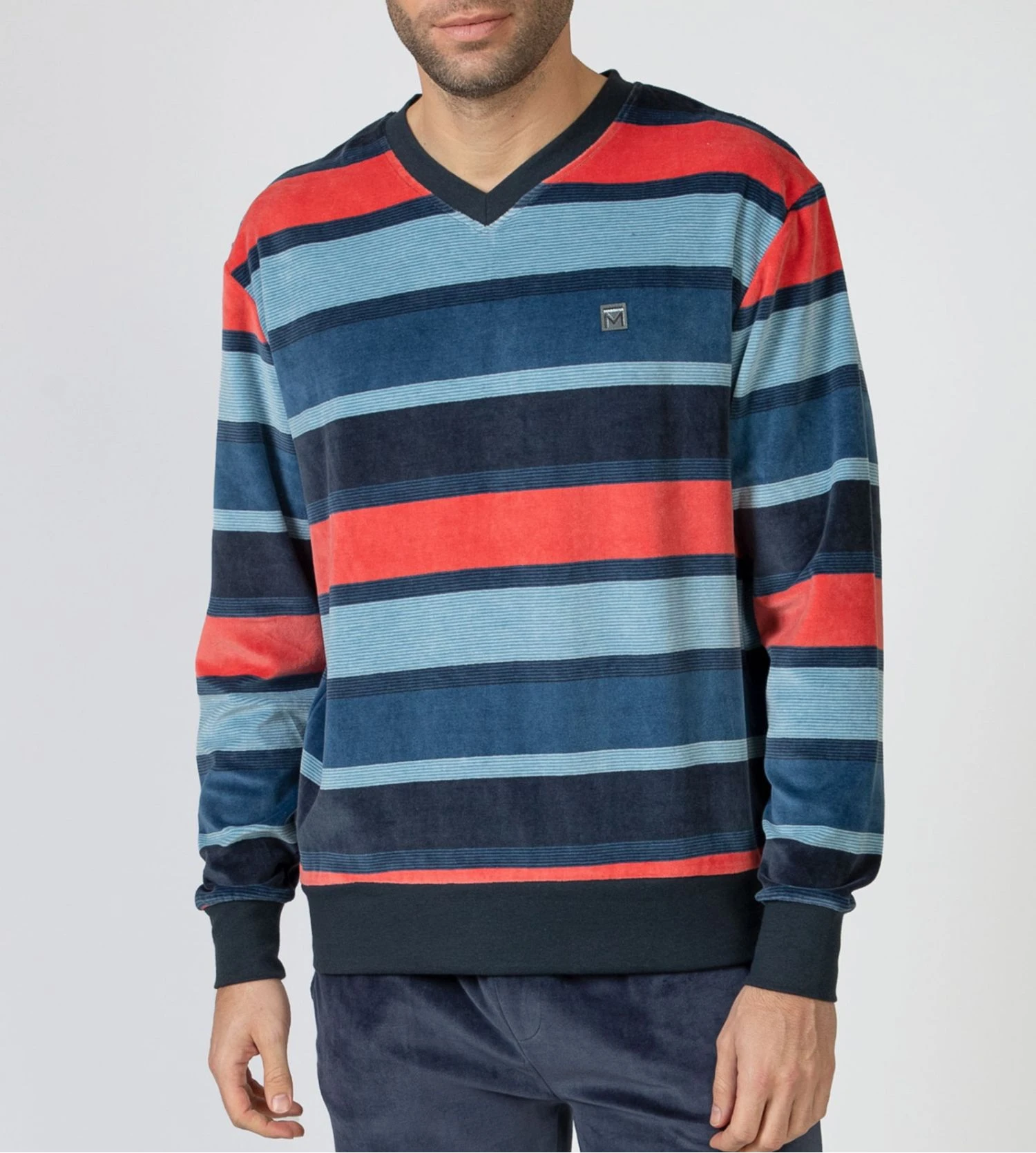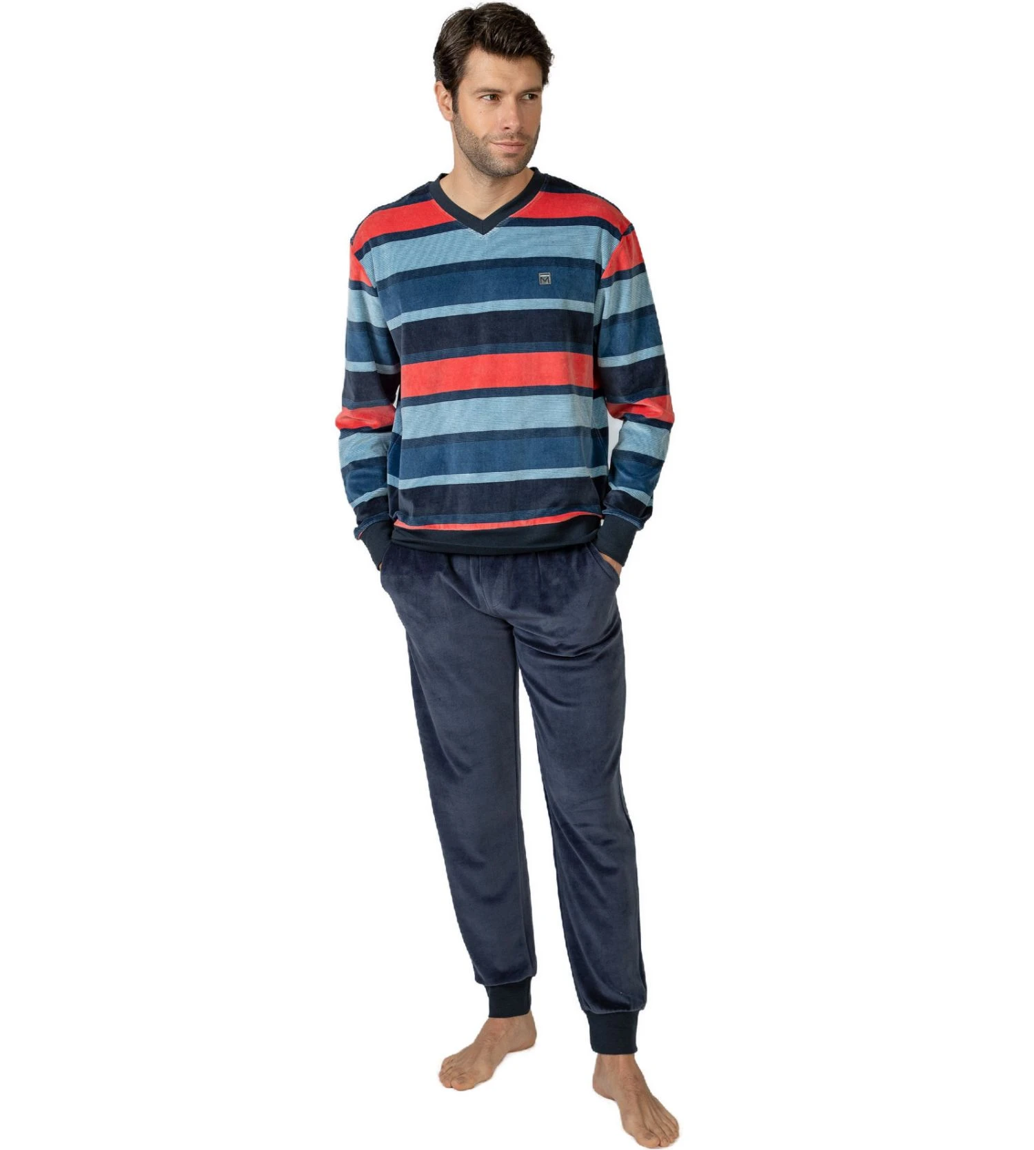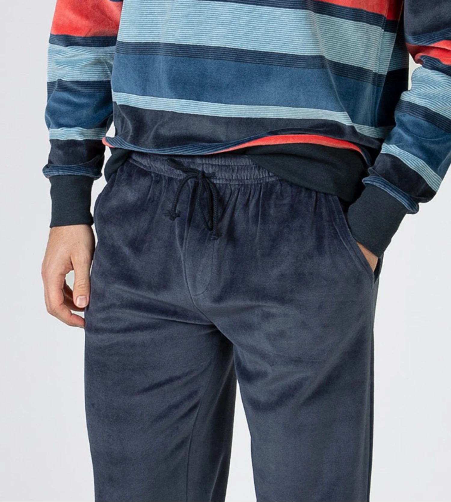 Ce pyjama pour homme se distingue par son haut en velours bleu marine texturé, élégamment orné de rayures horizontales multicolores qui apportent une touche de modernité. Le pantalon gris uni à coupe droite offre un contraste sophistiqué, parfaitement coordonné avec la finition de l’encolure en V.