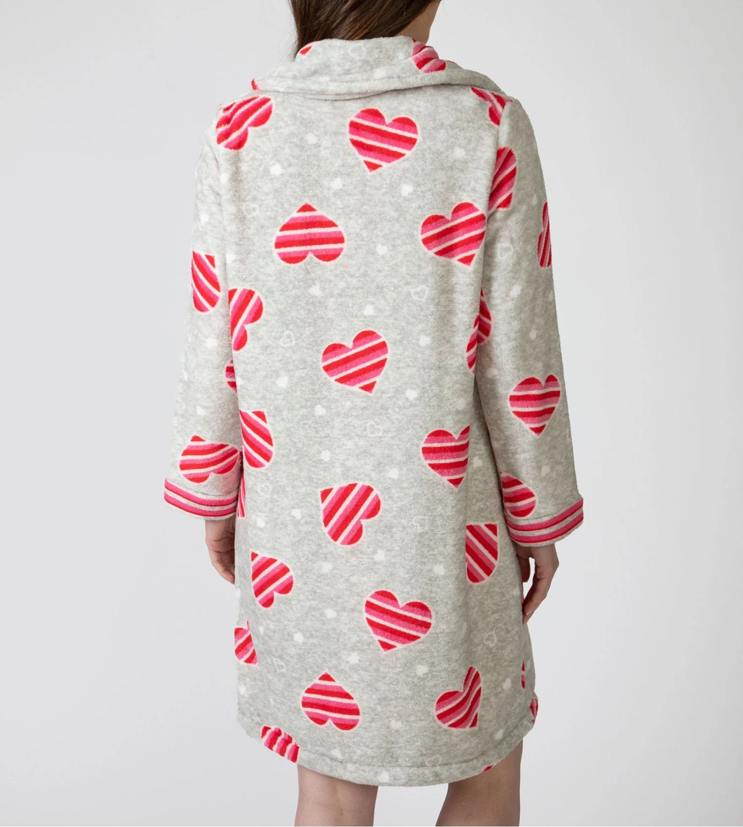 Visuellement, cette robe de chambre se distingue par sa base grise chinée apaisante, rehaussée par des motifs de cœurs à rayures rouges contrastés. Sa coupe longue et son col montant assurent une protection maximale contre les courants d’air, ce qui en fait un choix idéal pour les soirées fraîches.