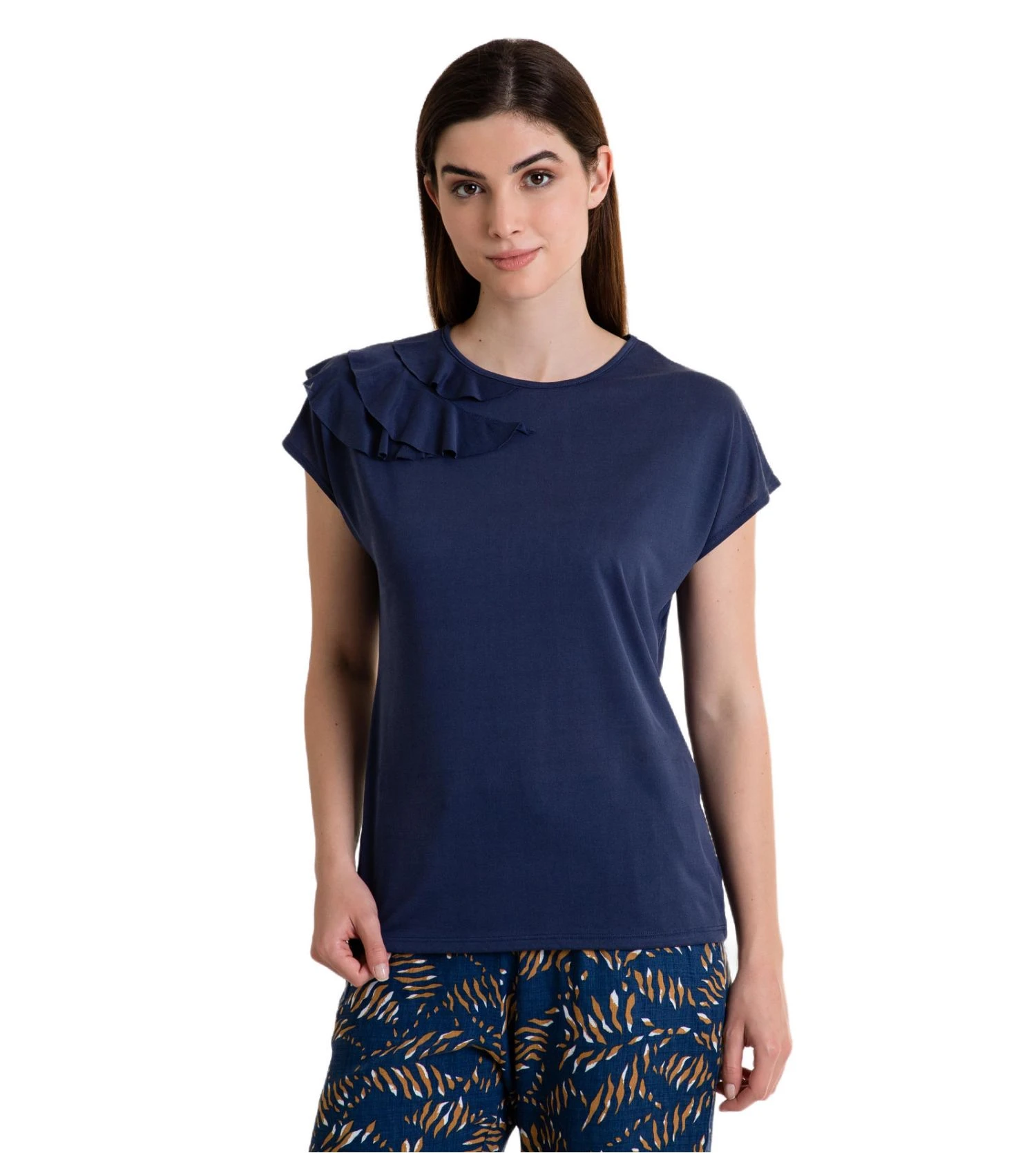 D’un coloris Bleu Marine intemporel, ce t-shirt arbore une superposition de tissu asymétrique sur le côté, créant un effet volanté dynamique. Ce détail architectural transforme un basique en une pièce forte de votre vestiaire prêt-à-porter.