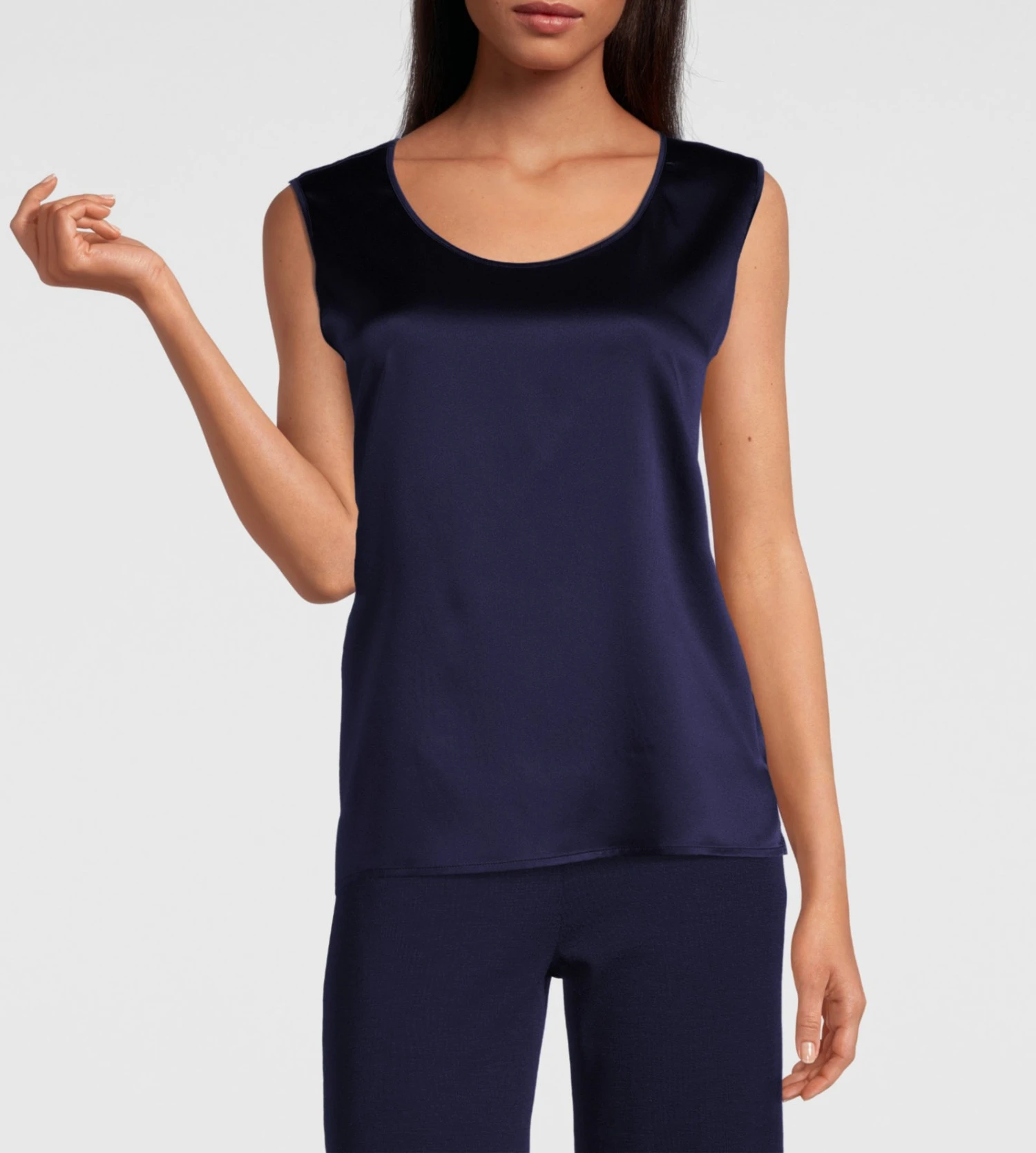 - Détails Visuels : Teinte bleu marine profonde, encolure large arrondie et silhouette fluide sans manches pour une élégance minimaliste.