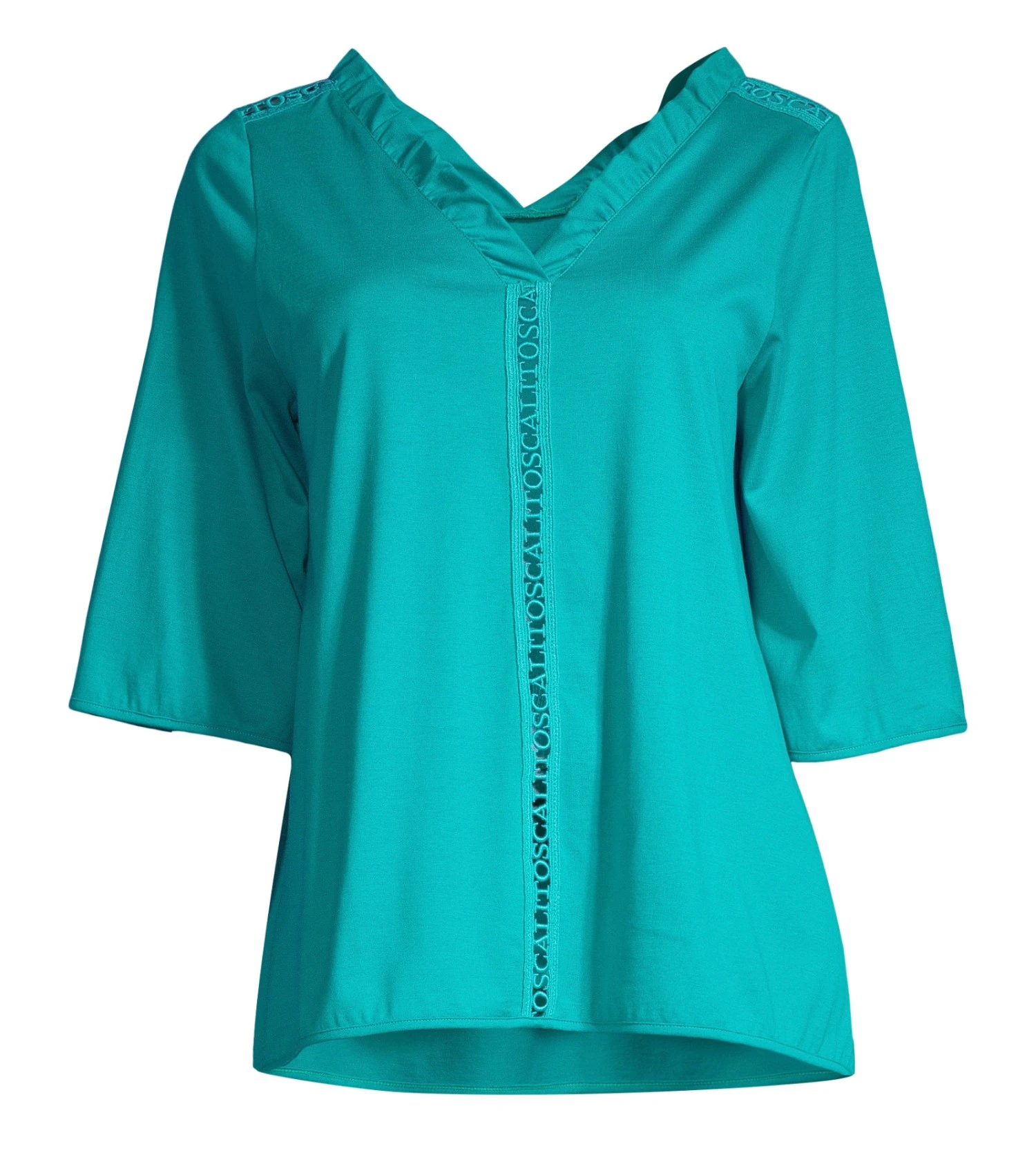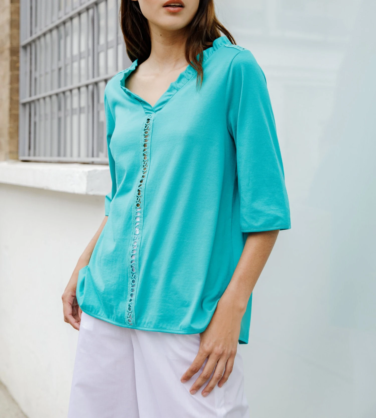 Experience the ultimate comfort and sophistication with this Oscalito turquoise cotton jersey shirt. Designed for those who appreciate fine details, this top combines breathable natural fibers with artisanal macramé lace for a truly elevated look.