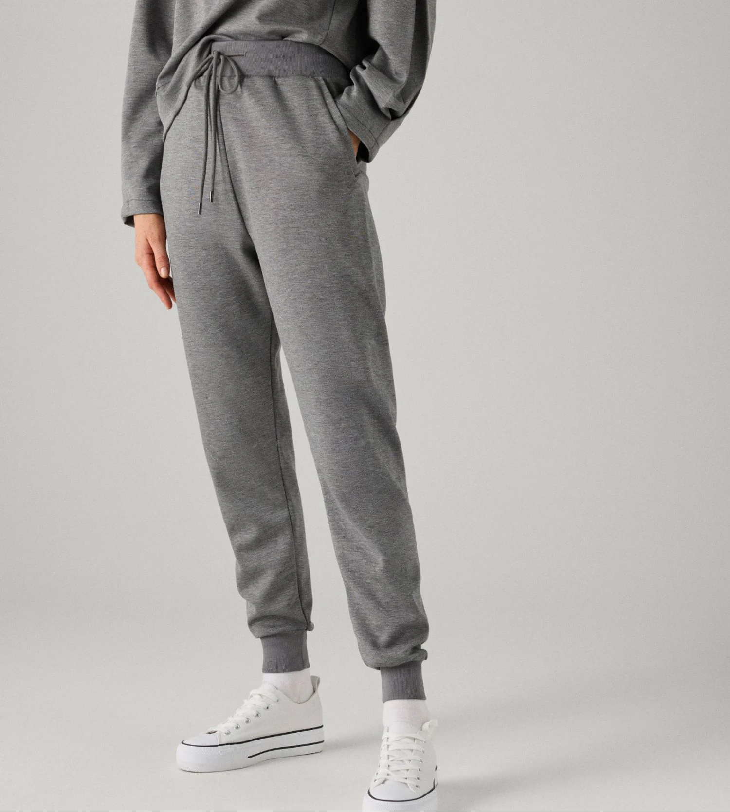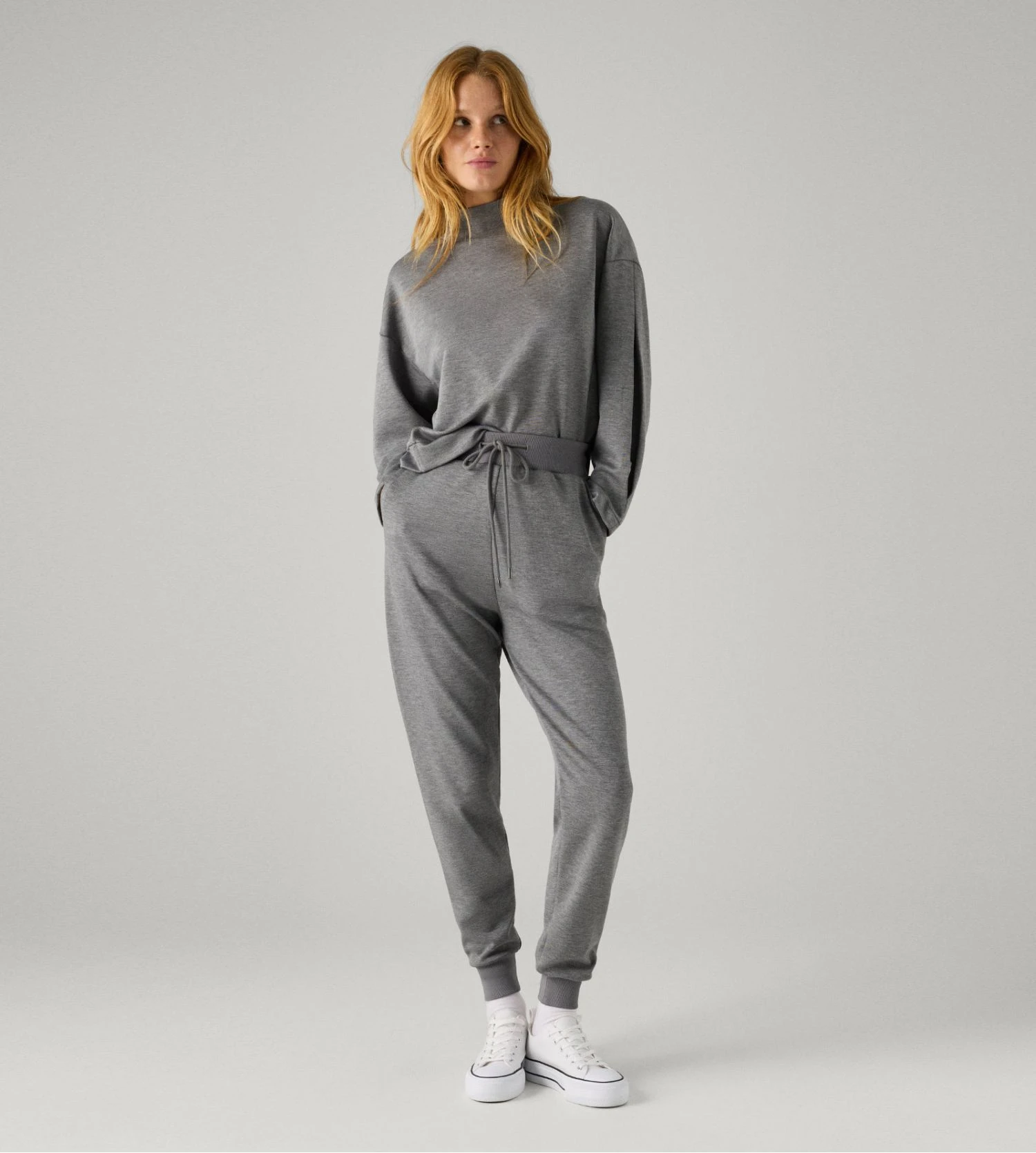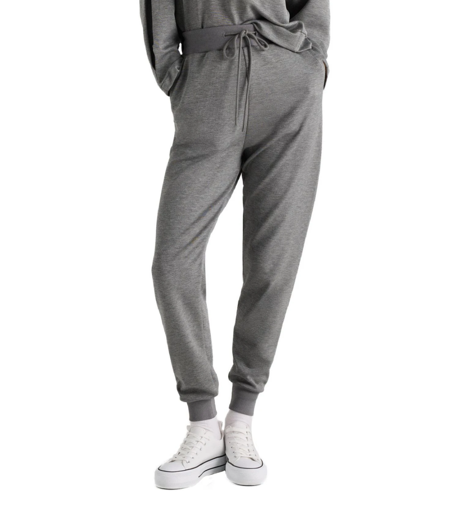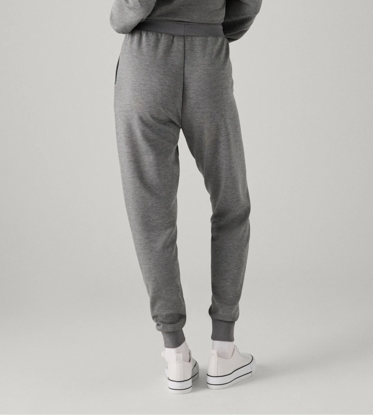Sa nuance grise chinée et sa coupe parfaitement ajustée créent une silhouette fluide et dynamique. Les ourlets resserrés aux chevilles apportent cette touche jogging contemporaine, tandis que la taille élastiquée garantit une liberté de mouvement totale tout au long de la journée ou de la nuit.