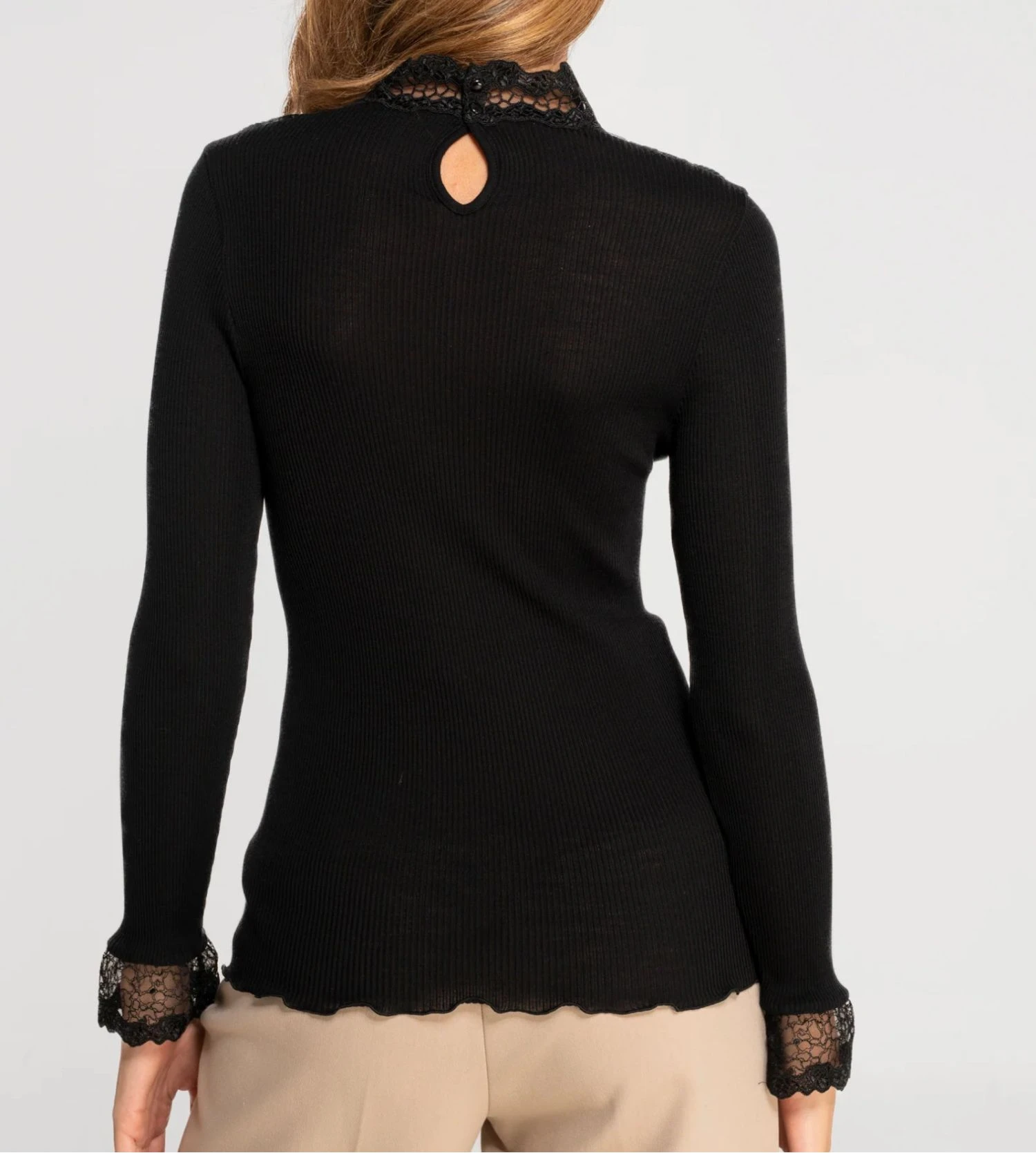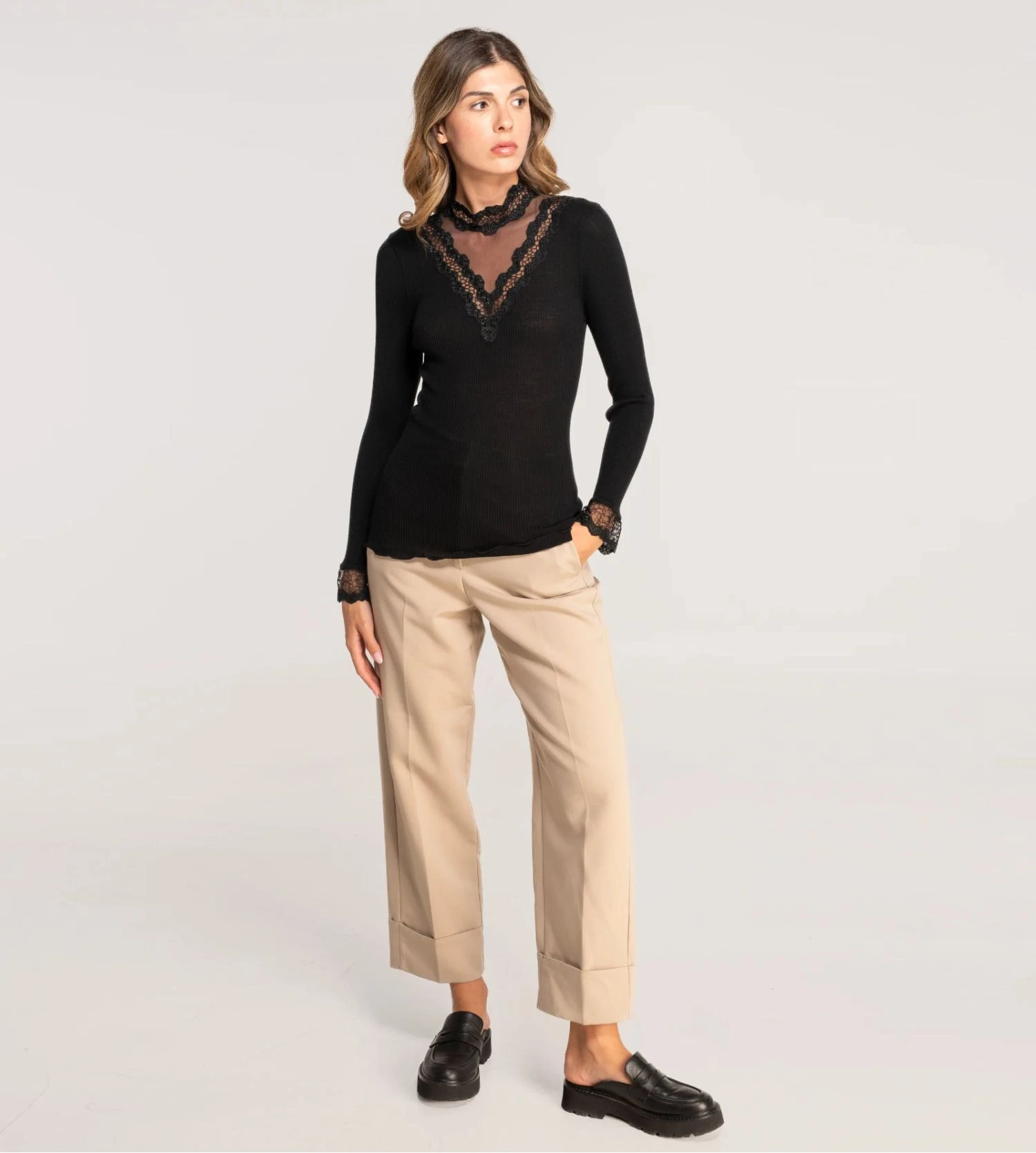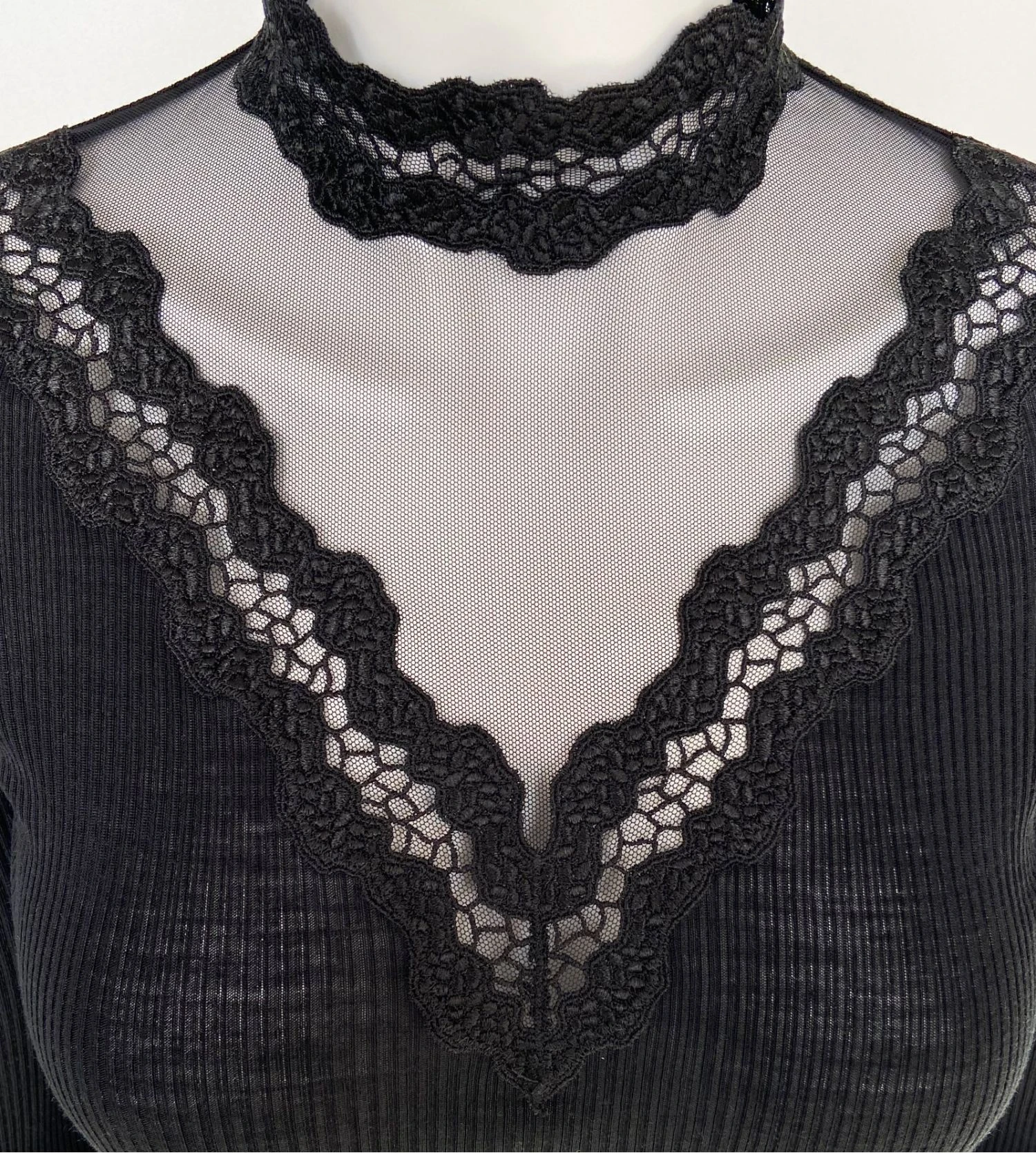 - Décolleté avec empiècement en V recouvert de tulle et de dentelle.