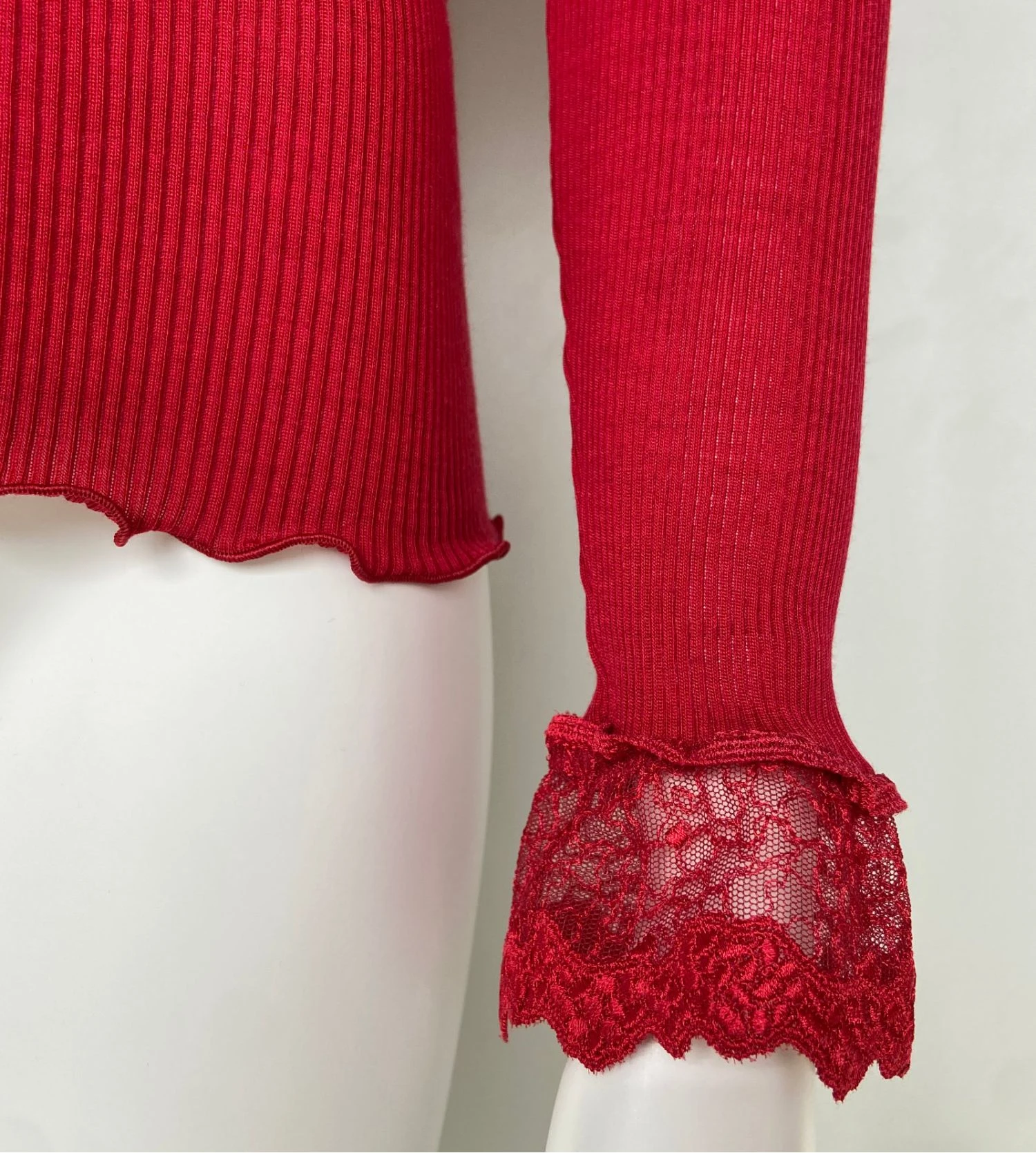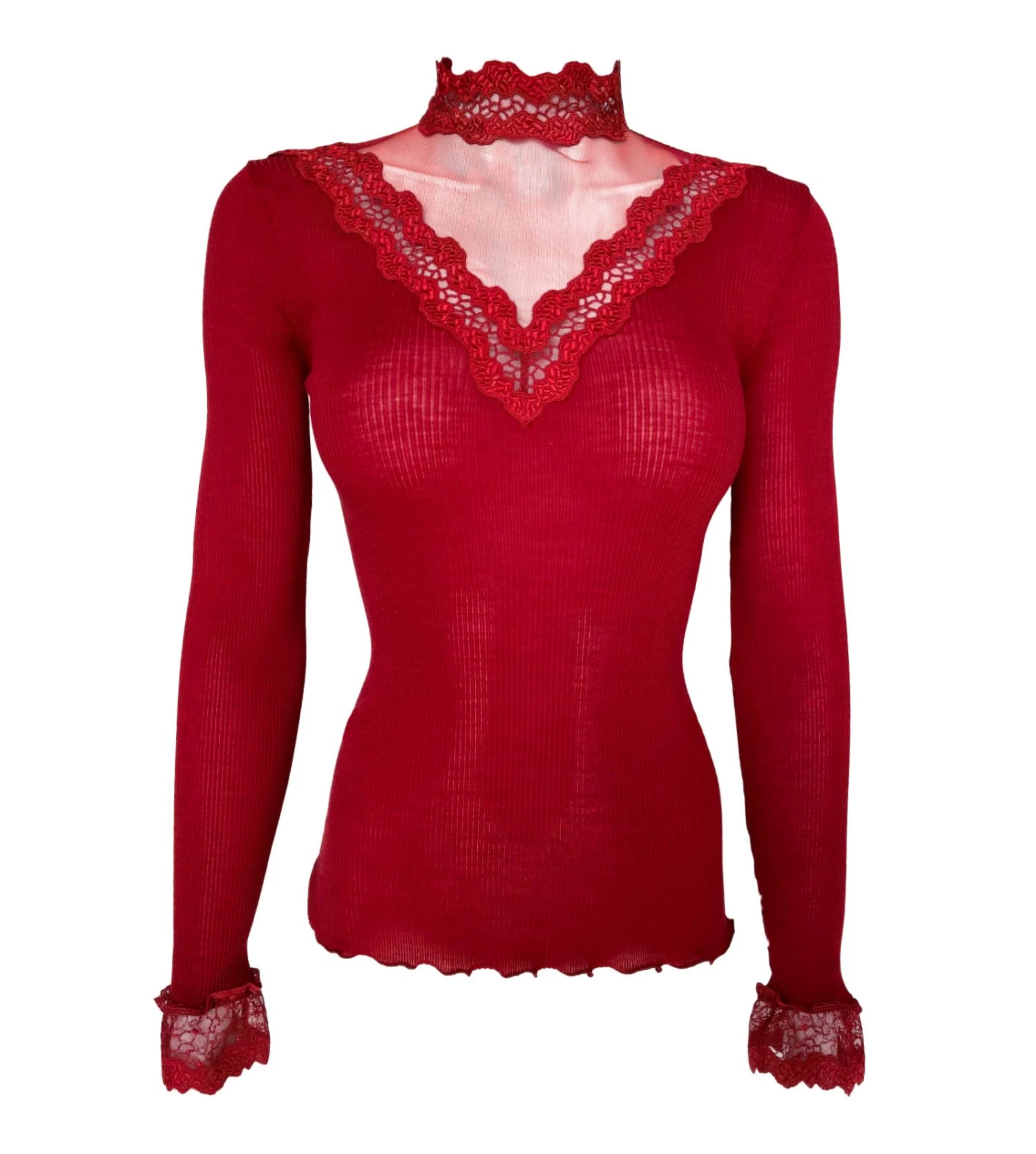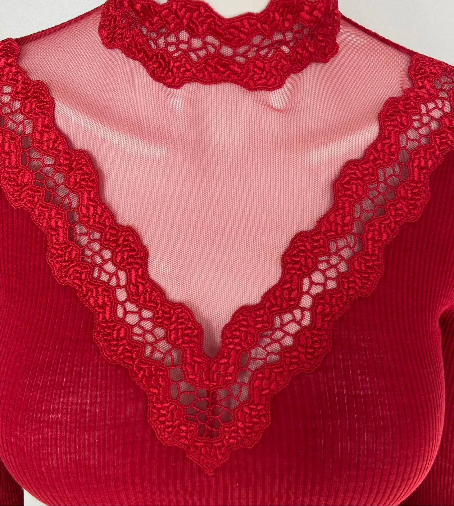 - Décolleté avec empiècement en V recouvert de tulle et de dentelle.