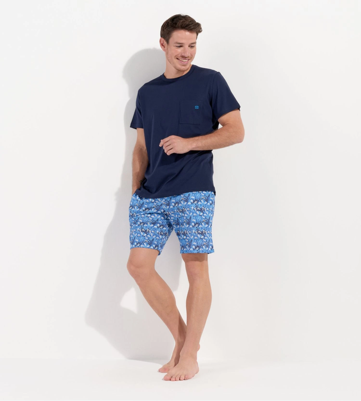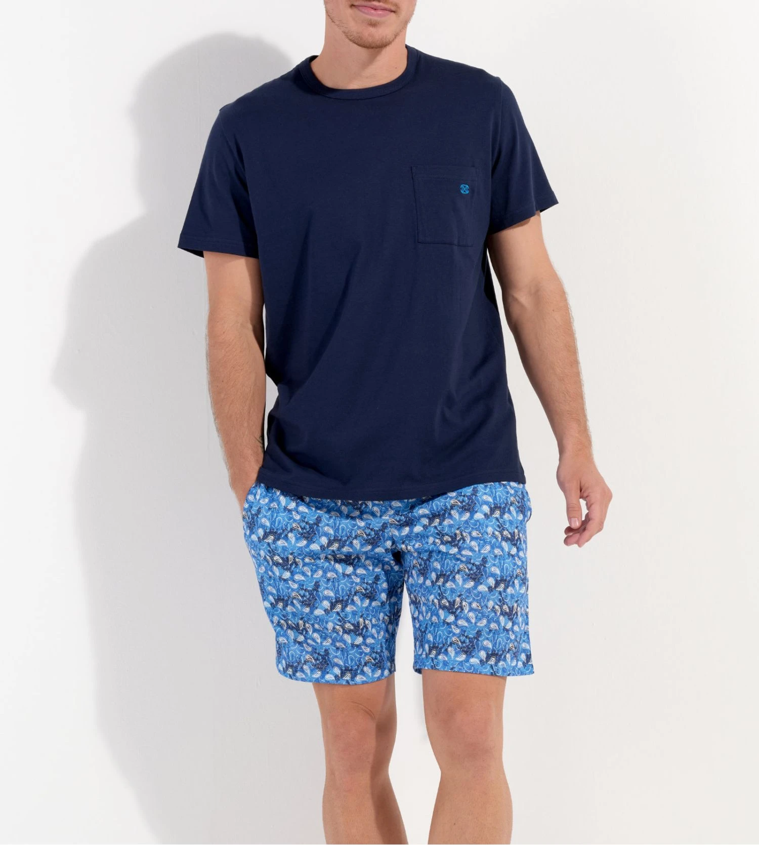 Ce modèle se distingue visuellement par son t-shirt bleu uni à col en V, agrémenté d’une poche poitrine fonctionnelle avec logo brodé, et son short assorti affichant un imprimé cachemire (paisley) blanc sur fond bleu profond. La qualité supérieure du coton permet une régulation naturelle de la température pour rester au frais toute la saison.