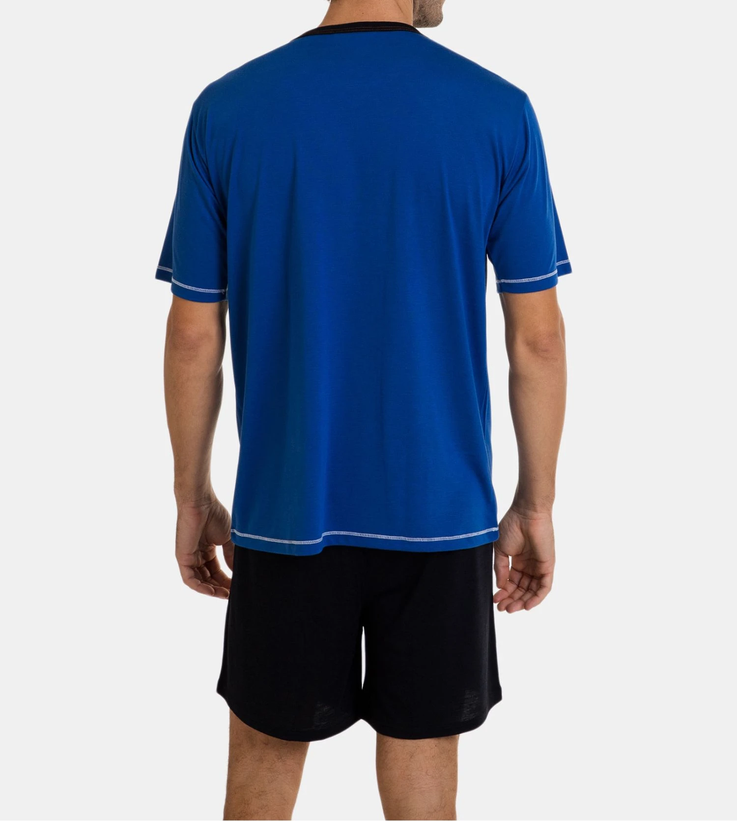 Ce pyjama court se distingue par sa teinte encre profonde et son graphisme frontal d’inspiration vintage représentant un vélo, apportant une touche urbaine à vos moments de détente. L’encolure est subtilement rehaussée d’une bordure contrastée bleu clair qui structure la silhouette avec élégance, tandis que le short assorti offre une liberté de mouvement totale.