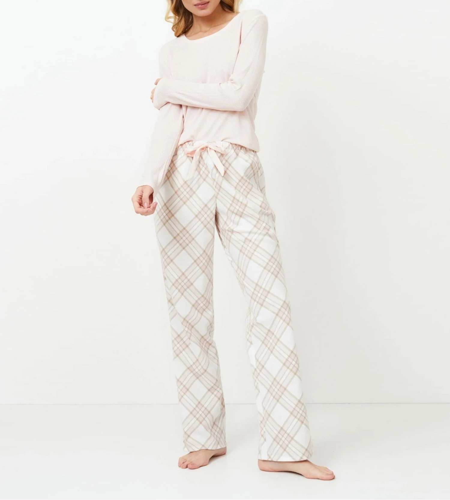 - Pantalon à carreaux blancs, beiges et roses.