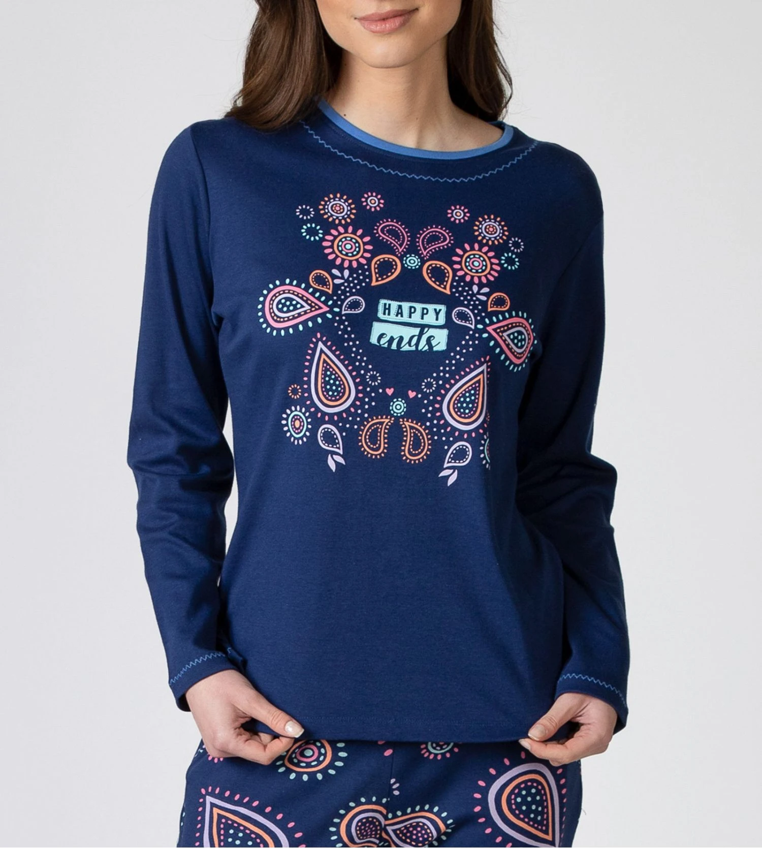 Cet ensemble se compose d’un haut bleu marine profond arborant l’inscription positive ‘Happy Ends’ à l’avant, associé à un pantalon droit bleu orné de motifs géométriques colorés et fun pour une touche de modernité.