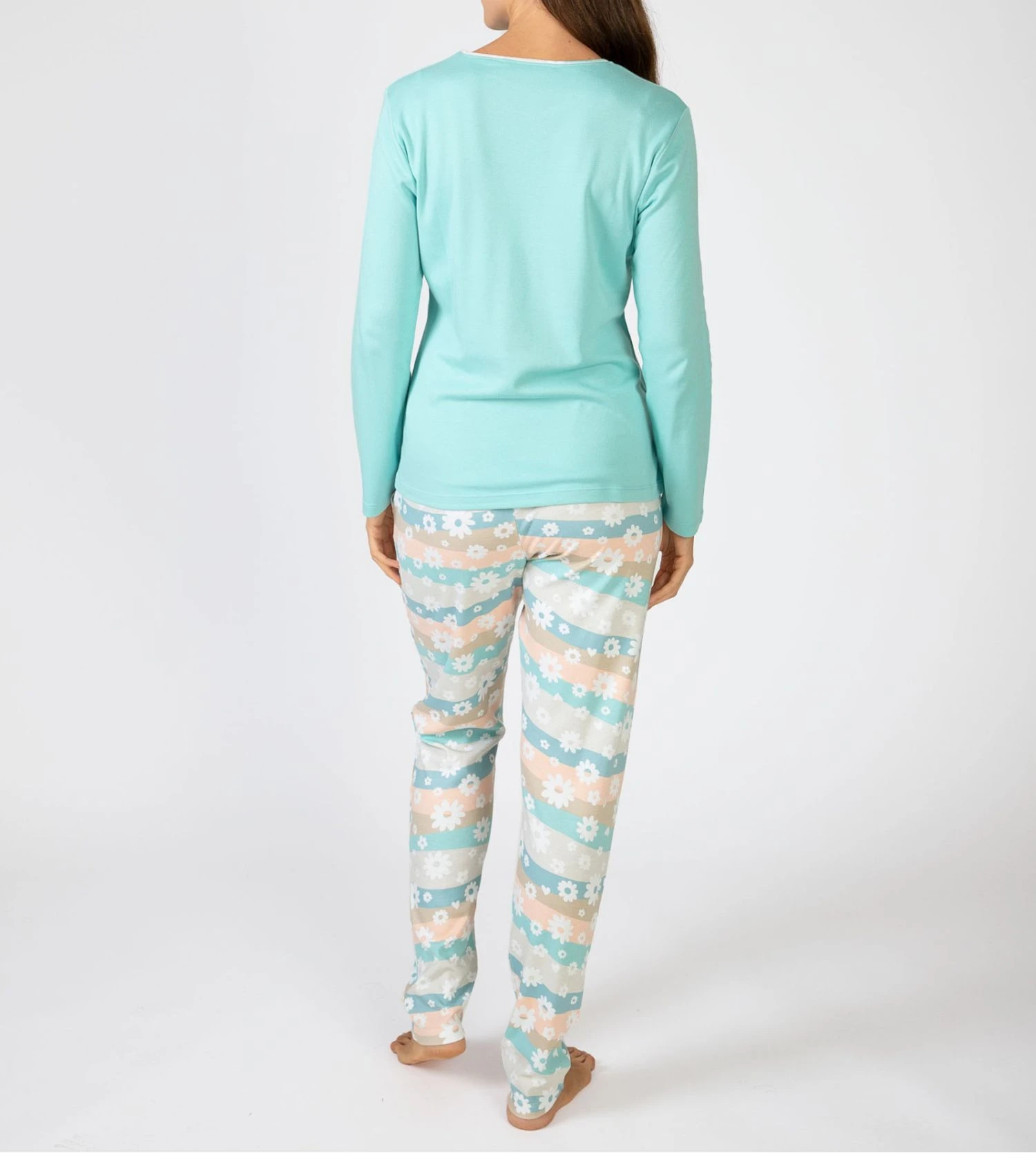 - Design Visuel : Le haut à manches longues arbore un coloris bleu turquoise apaisant avec l’imprimé inspirant « Make Luck ». Le pantalon contraste joliment avec un motif coloré parsemé de délicates petites fleurs blanches.