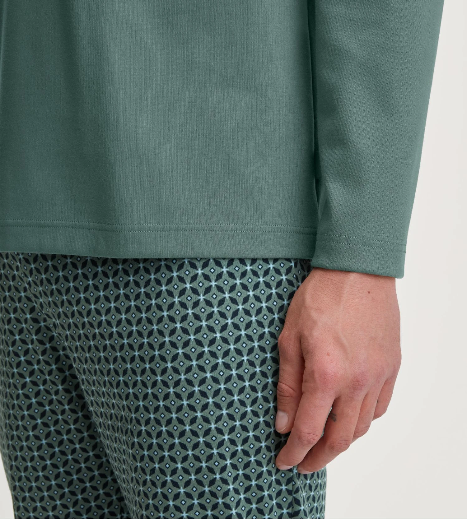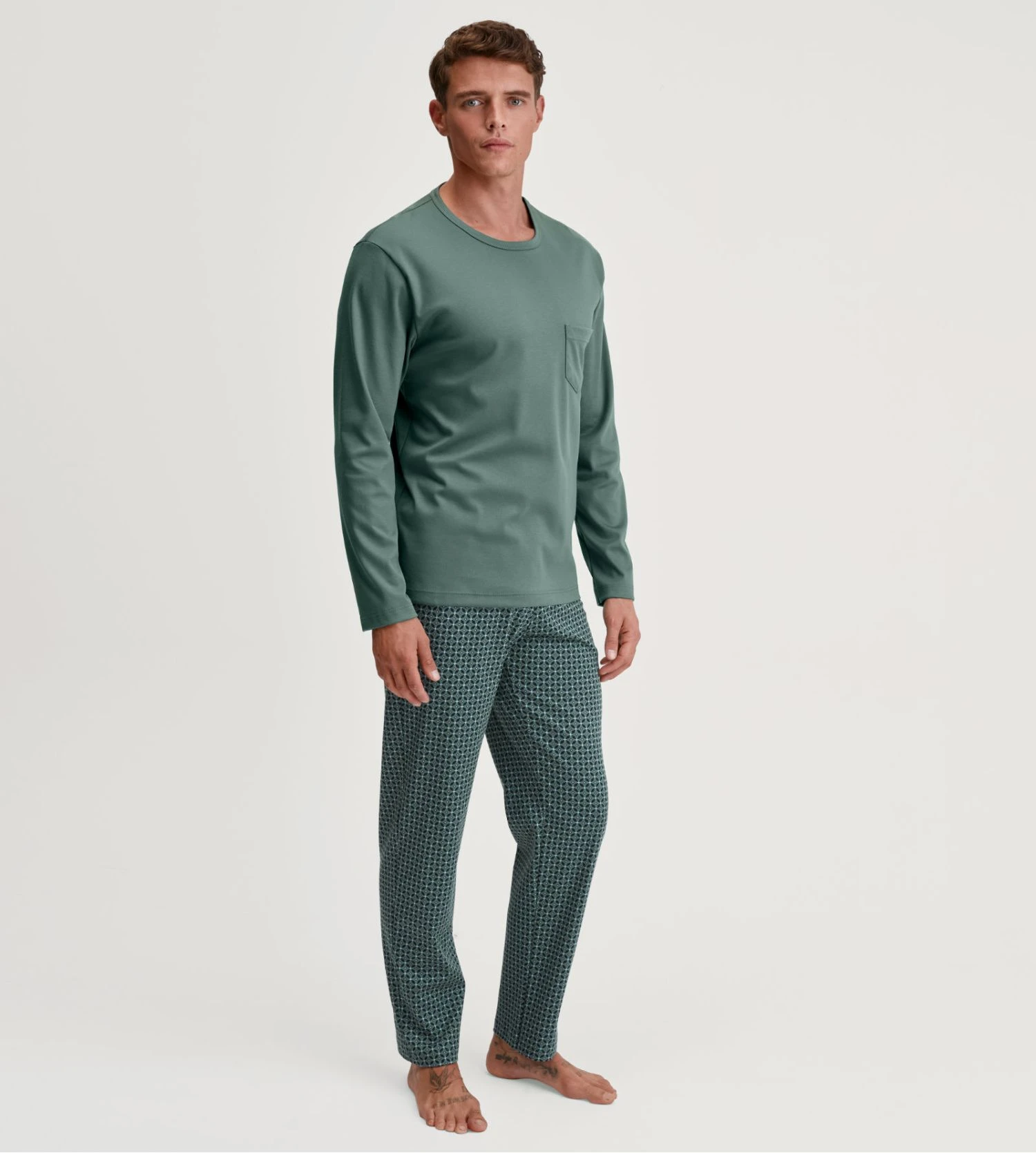 Ce modèle se distingue par son haut à manches longues d’une teinte Vert Sauge apaisante, rehaussé d’une poche poitrine fonctionnelle. Il est harmonieusement coordonné à un pantalon à coupe droite arborant un imprimé Dark Glen élégant, offrant un contraste visuel sophistiqué fidèle à l’excellence de la marque suisse.