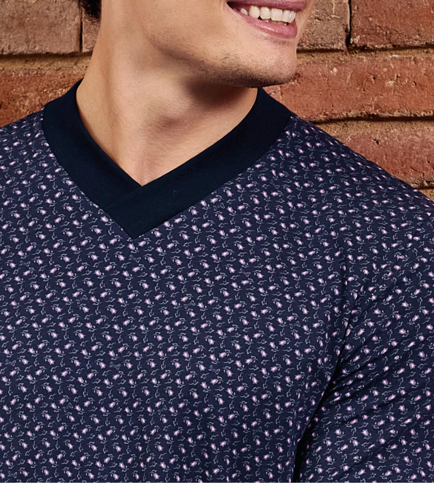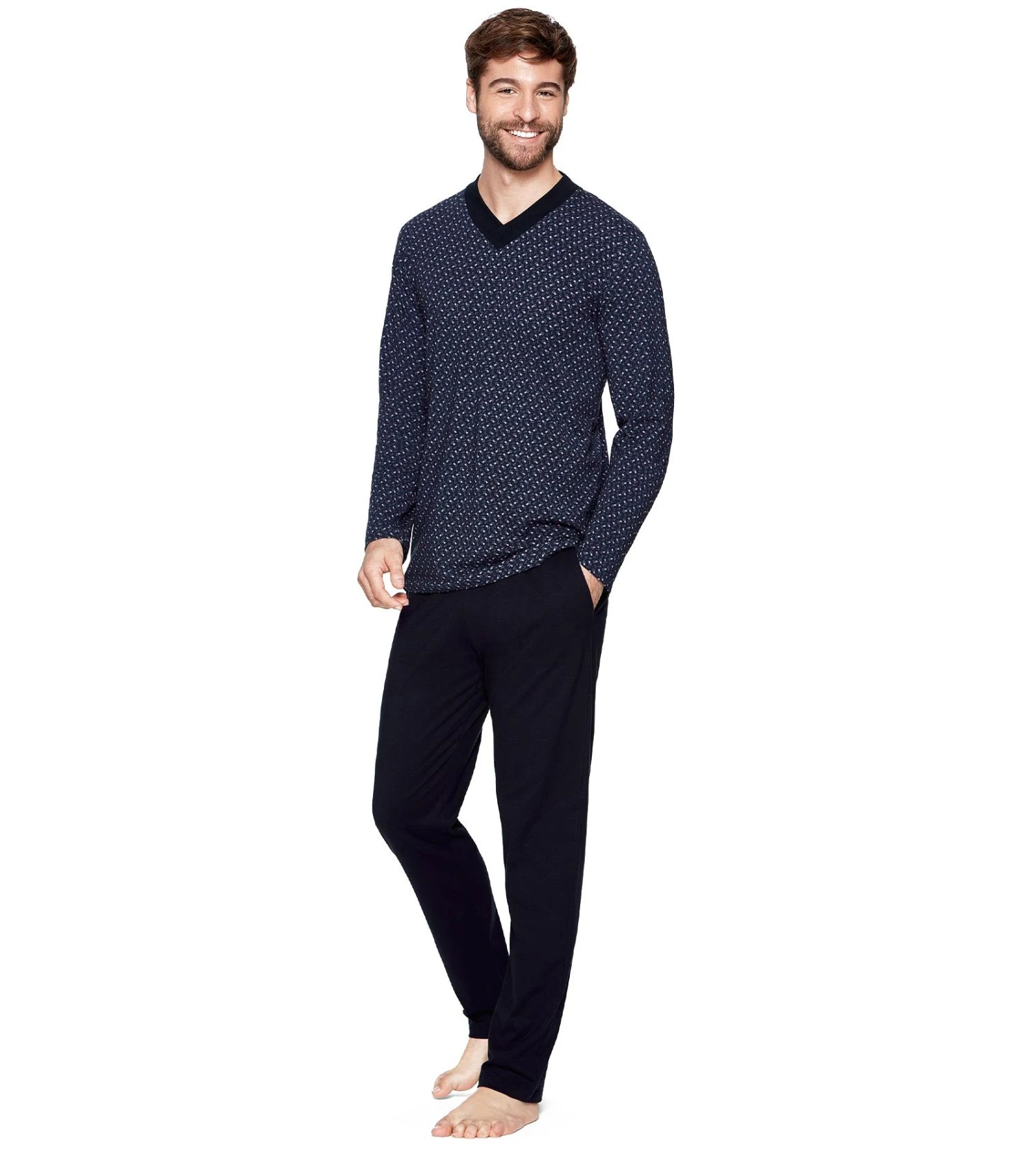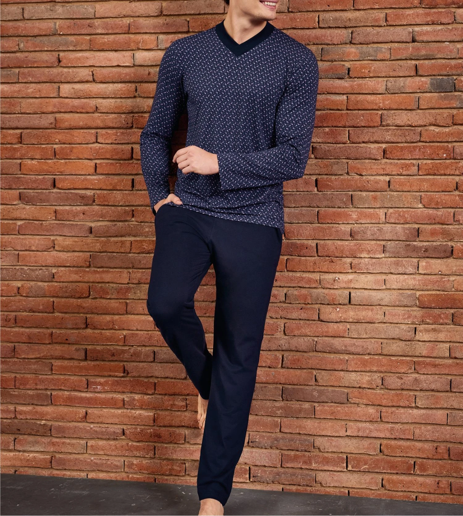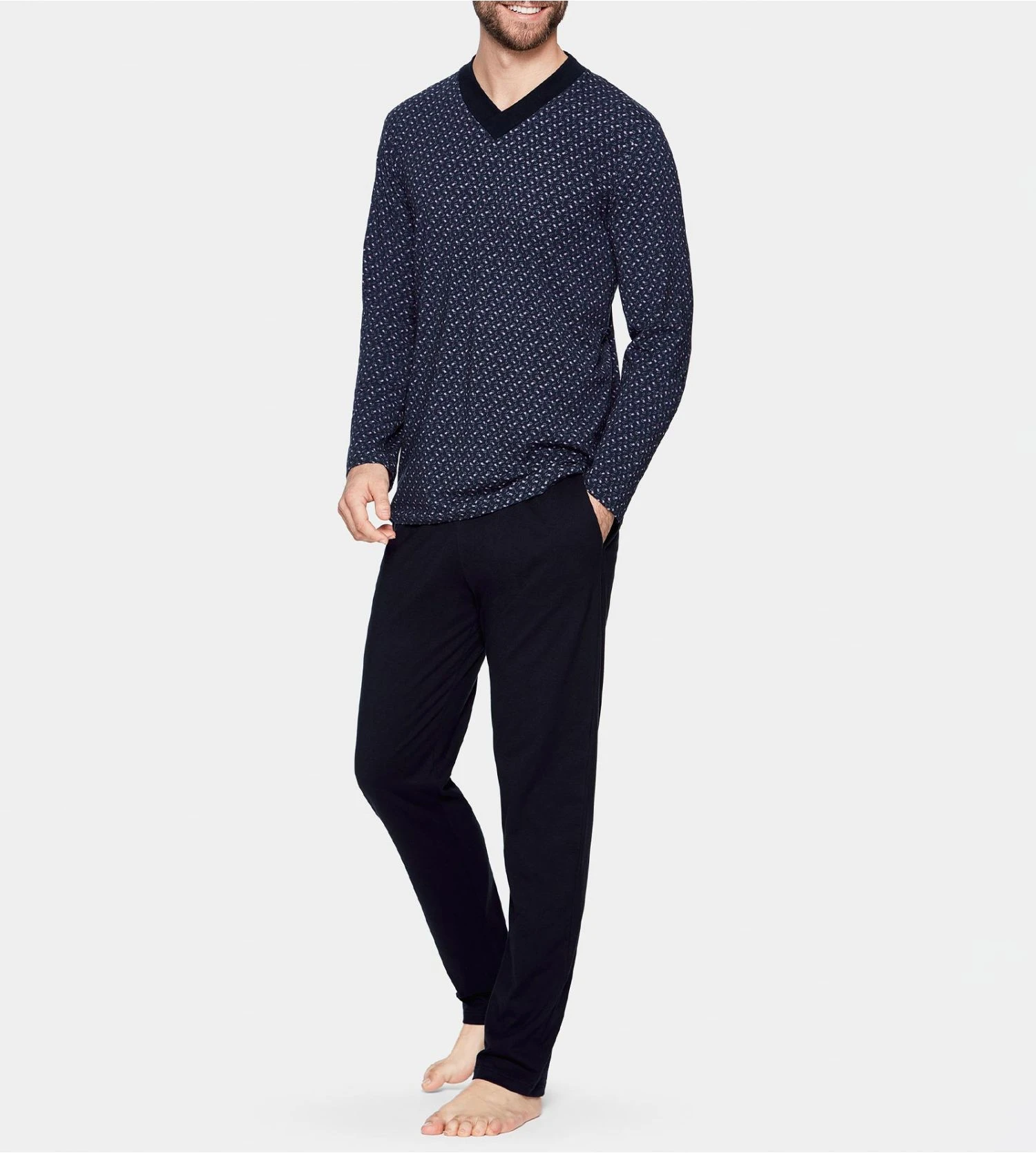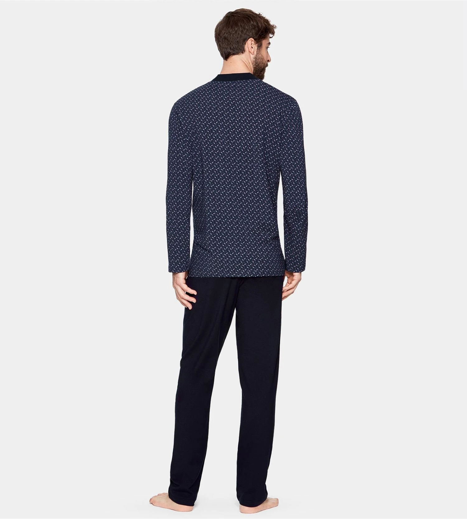 Le haut de ce pyjama se distingue par son discret motif floral ton sur ton sur un fond bleu marine profond, rehaussé d’un col en V contrasté qui structure la silhouette. Le pantalon uni assorti offre une liberté de mouvement totale grâce à sa coupe fluide et sa taille élastiquée, idéale pour une nuit paisible ou une soirée homewear.