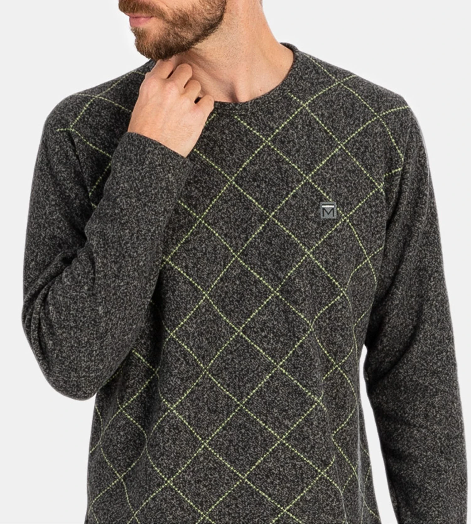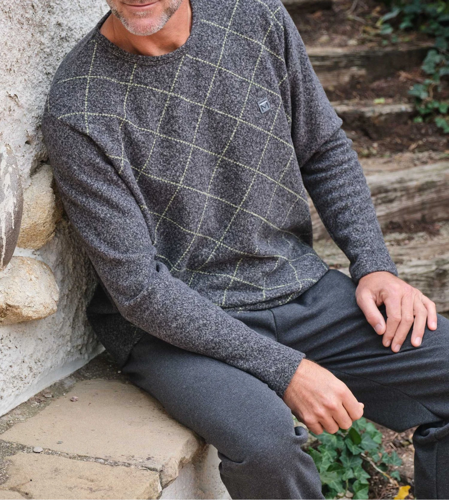 - Le Haut : Un t-shirt à manches longues en coloris anthracite chiné, agrémenté d’un imprimé graphique subtil et du logo Massana brodé sur la poitrine pour une touche de distinction.