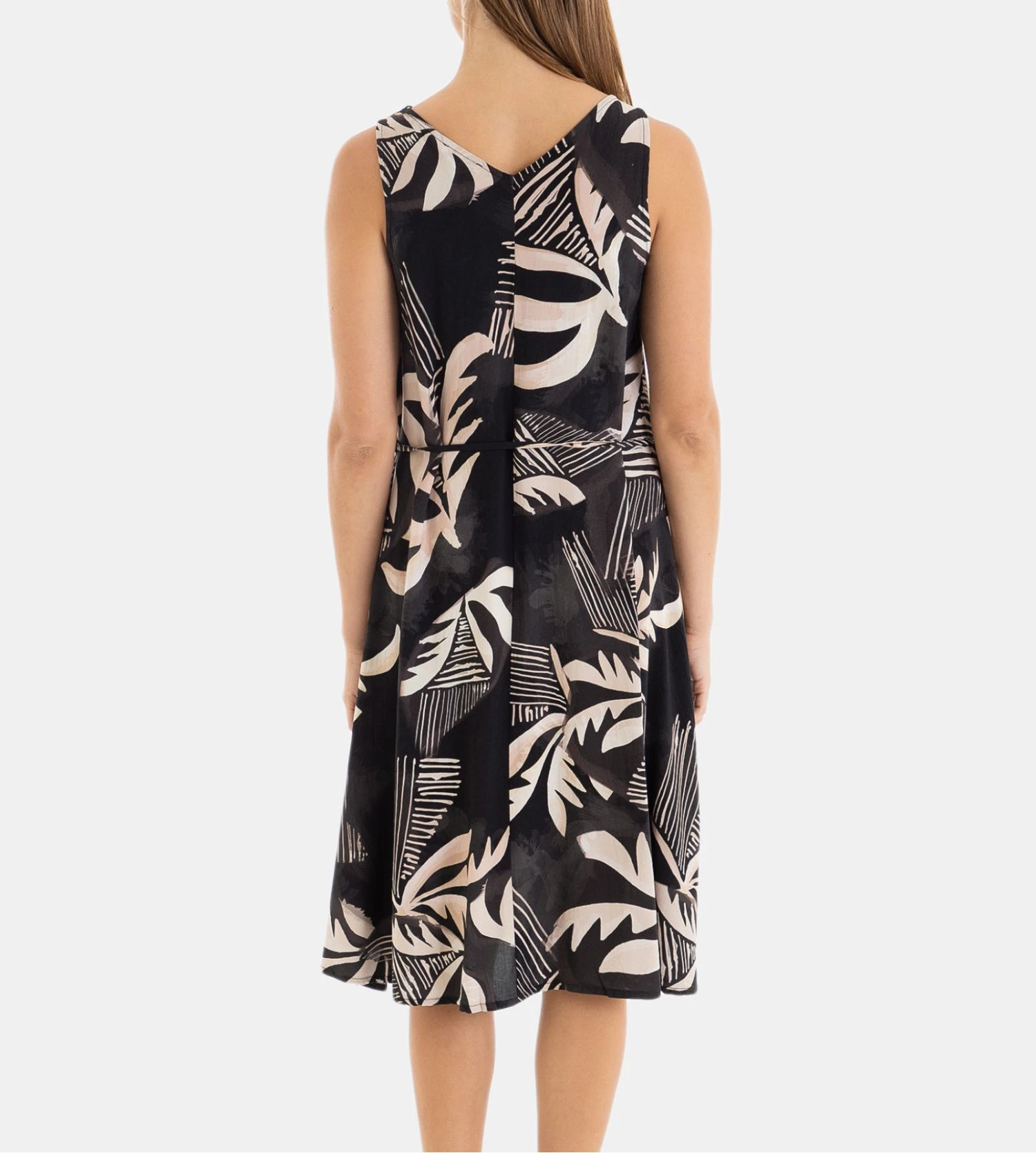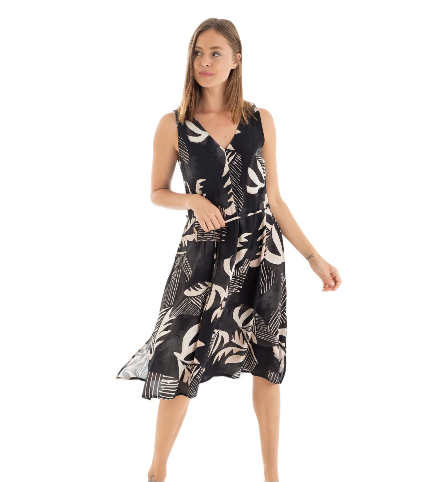 Cette robe légère Massana est la pièce idéale pour affronter la chaleur avec style. Son design sans manches et sa coupe fluide offrent une liberté de mouvement totale pour vos journées d’été. Son imprimé contrasté noir et beige apporte une sophistication moderne à votre garde-robe estivale.