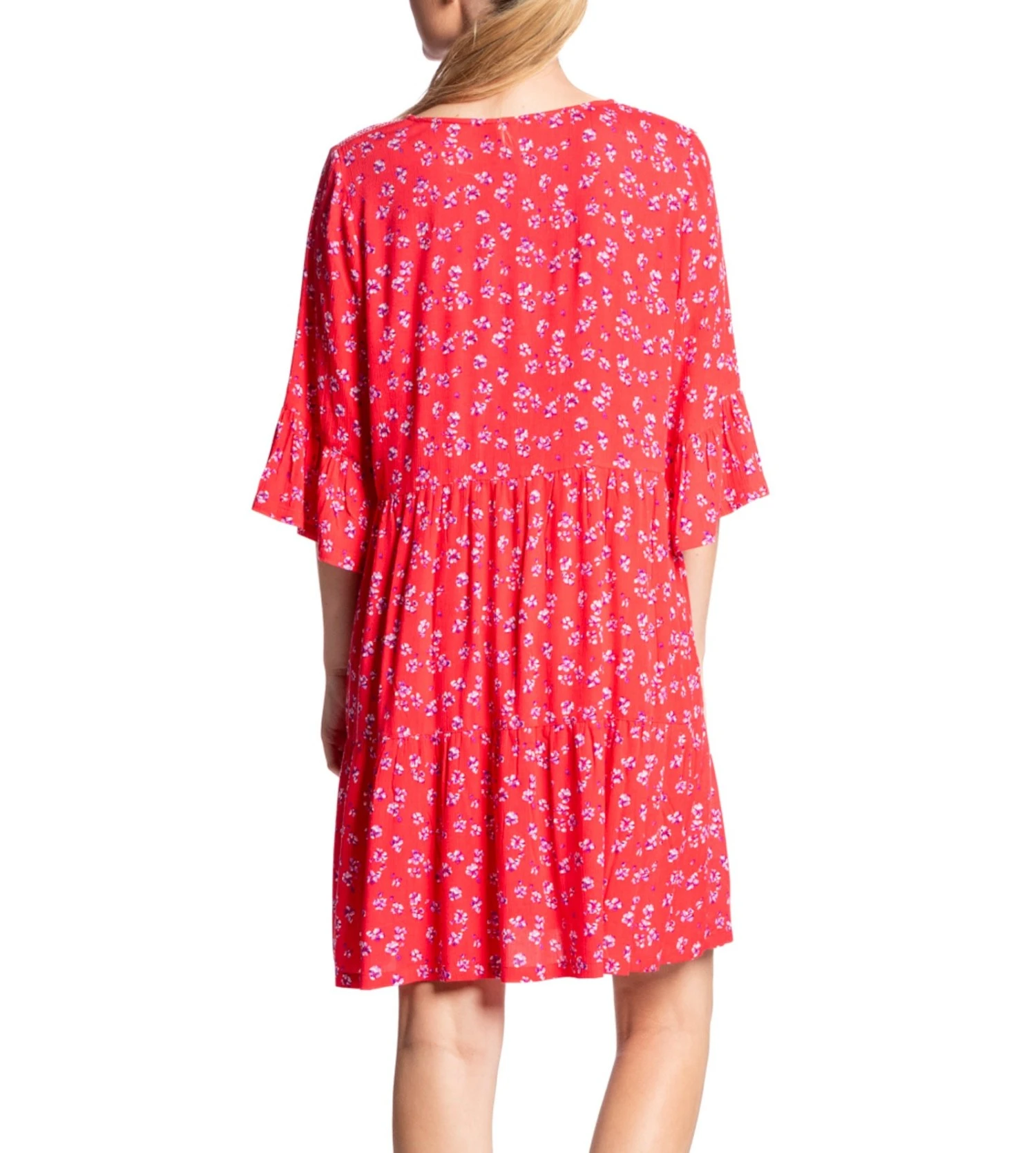 The dress showcases a bold red base accented by an intricate floral pattern. It features elegant 3/4 length sleeves and a fluid cut that ensures maximum comfort. The ruffled hem and cuffs add a feminine, vintage-inspired touch that transitions perfectly from beachside lounging to city walks.