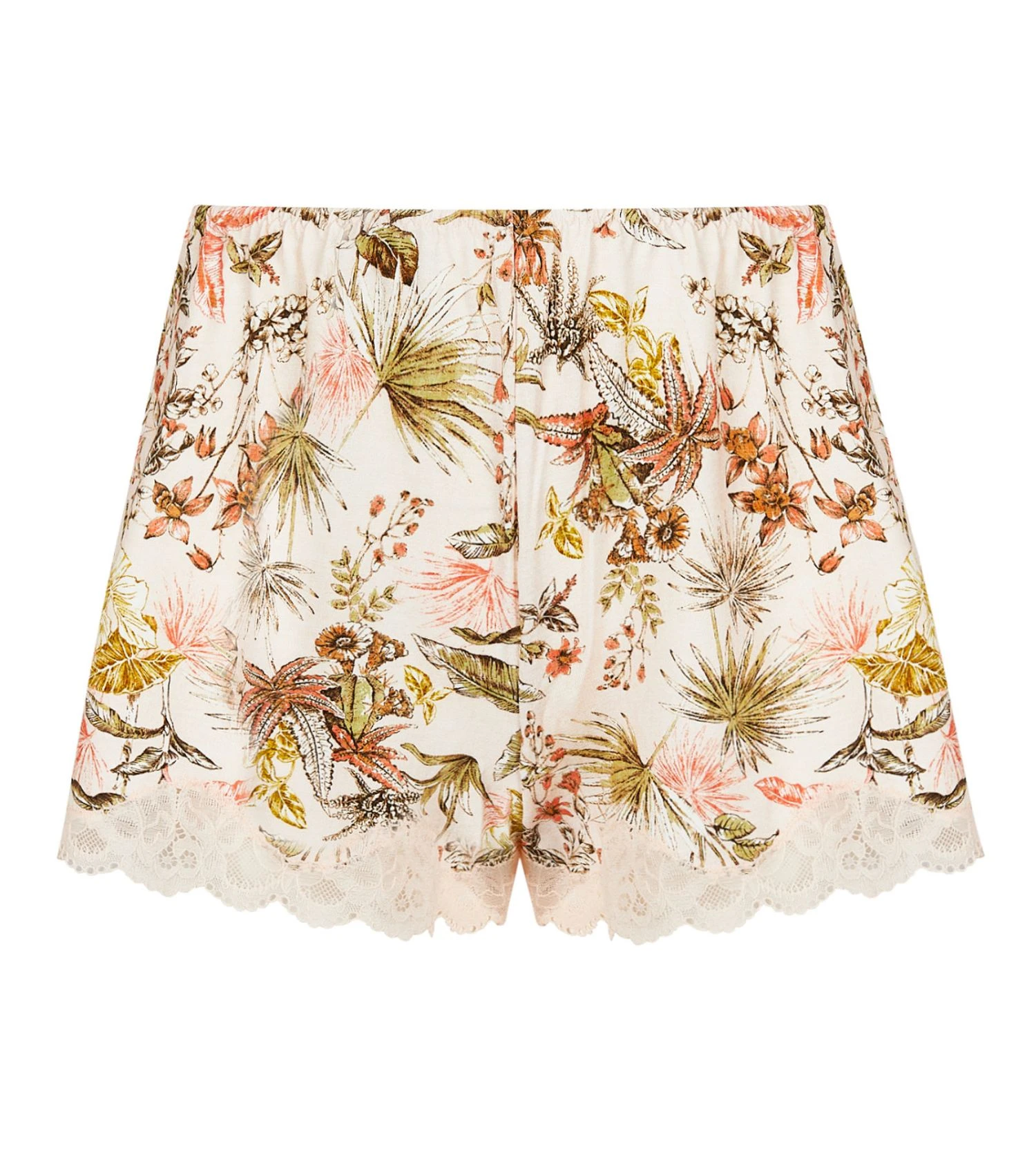 Ce short se distingue par son imprimé floral exclusif inspiré de la toile de Jouy, revisité dans une version tropicale aux nuances apaisantes de Vert Mousse. Un délicat galon de dentelle vient border les cuisses, apportant une touche de féminité sophistiquée à cette pièce de homewear.