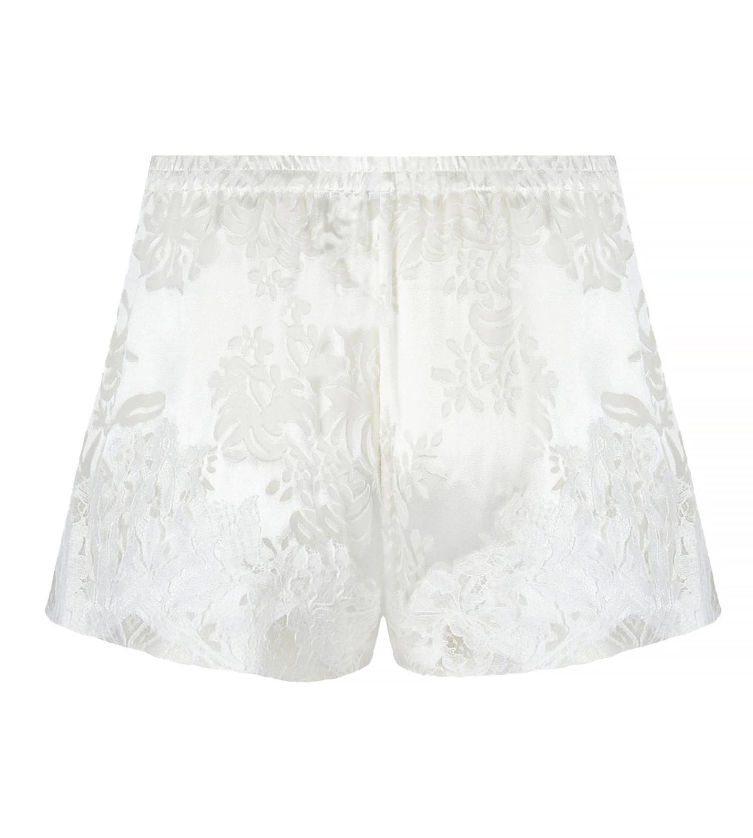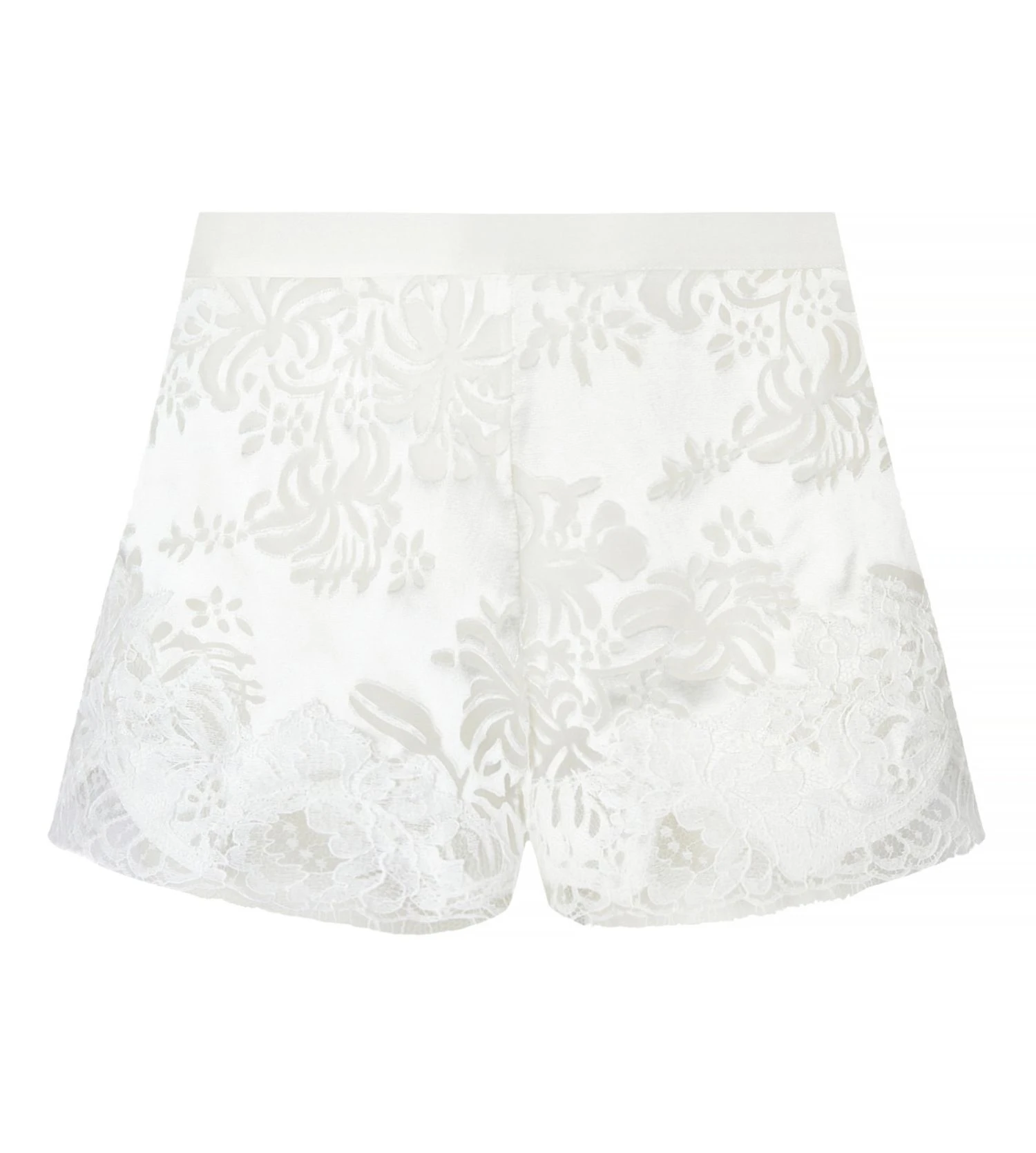 Ce short se pare d’une nuance lumineuse Écru Nacre, sublimée par un mélange de viscose et de soie dévorée créant des reflets subtils. Les ourlets sont délicatement garnis d’un galon de dentelle Rachel Jacquardtronic, offrant des motifs ajourés en relief pour une allure sensuelle et moderne.