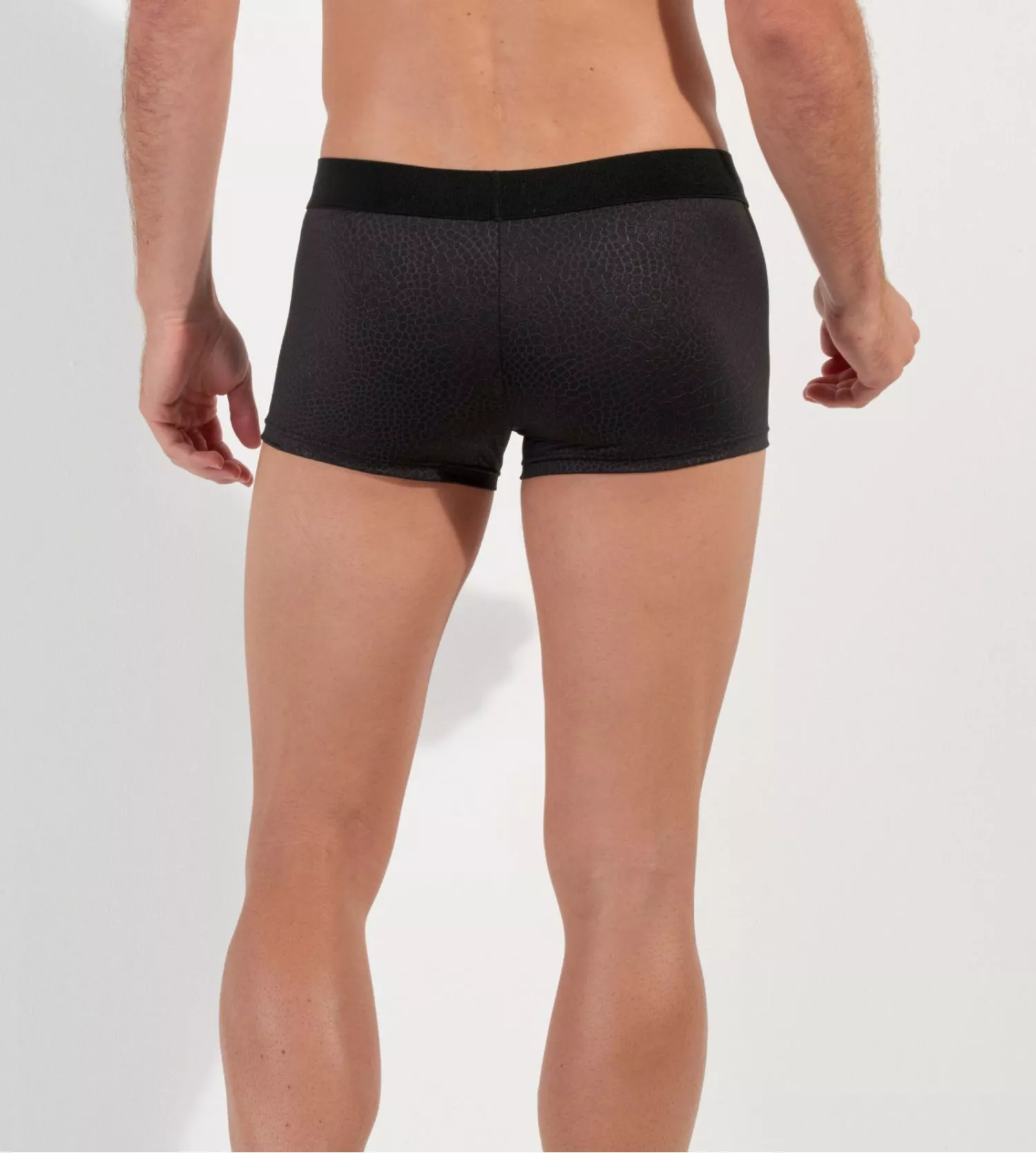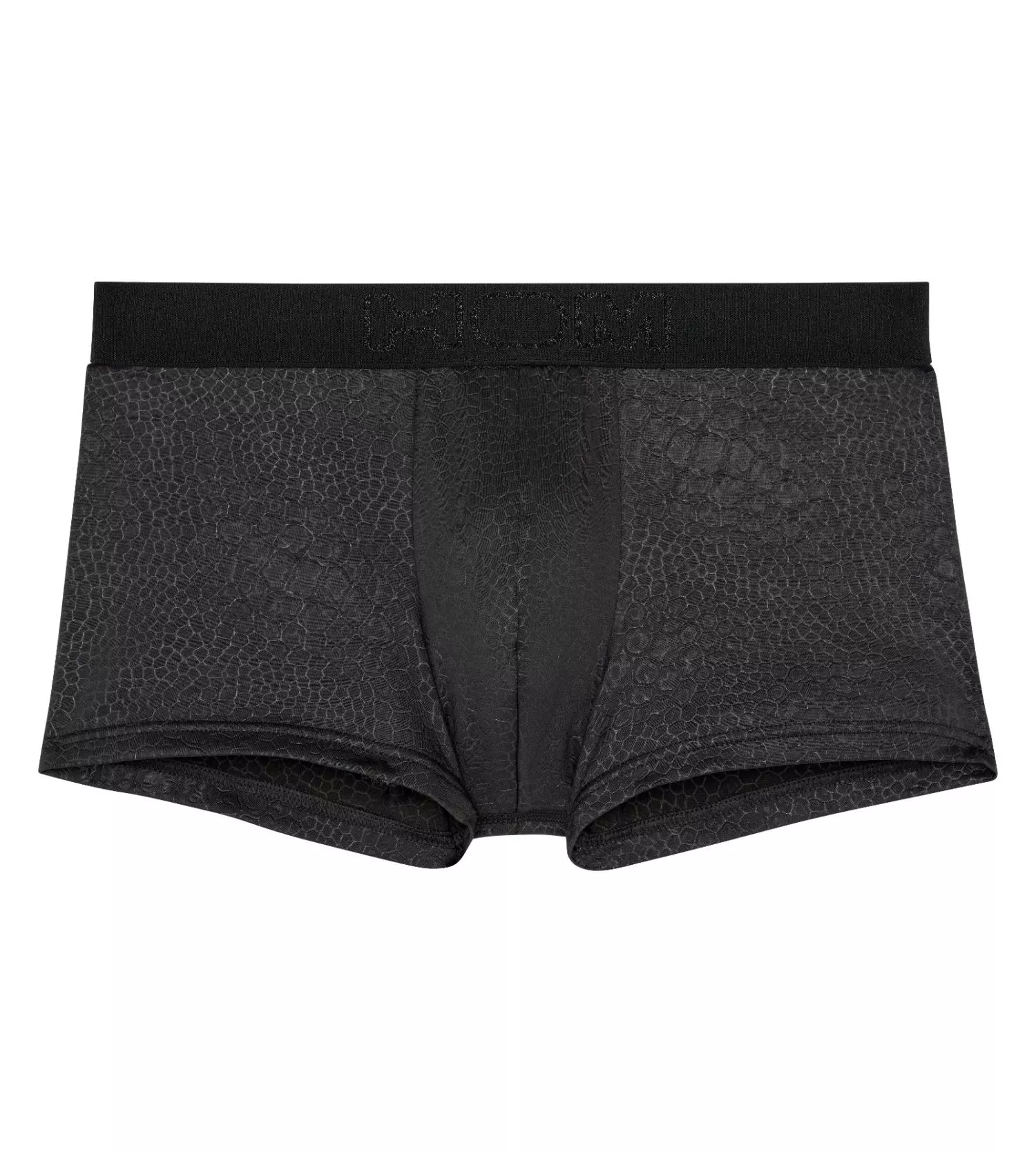 Affirmez votre masculinité avec le shorty FLORIDA de la gamme exclusive Temptation de HOM. Ce sous-vêtement d’exception combine un fini effet cuir noir sophistiqué avec un motif d’écailles de reptile captivant, offrant un look à la fois provocateur et élégant pour les moments spéciaux.