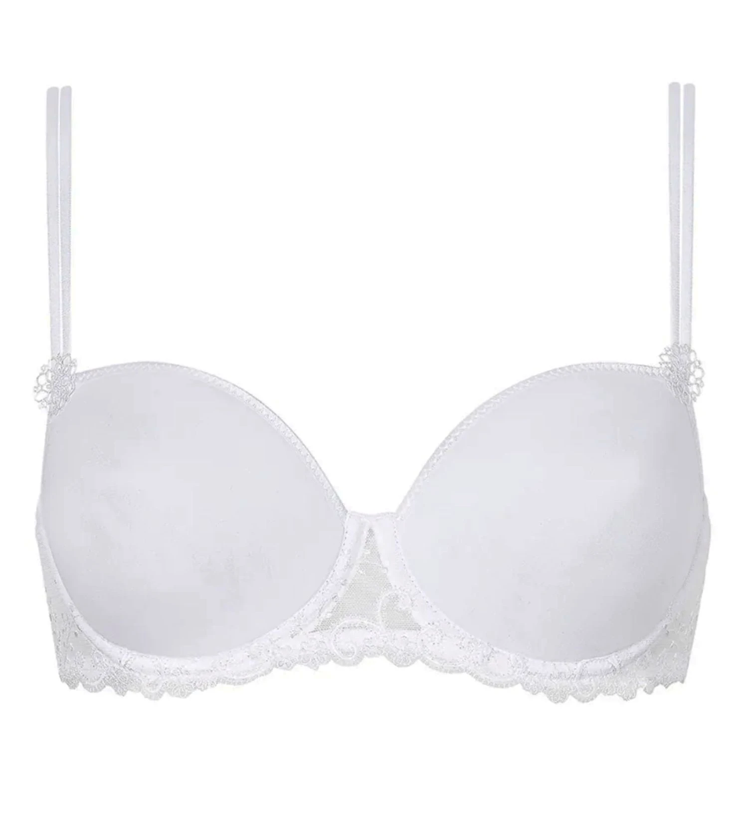 Séparateur et demi-dos brodés et doublés de tulle rigide. Les bretelles spaghettis sont dotés d’un motif en guipure florale.