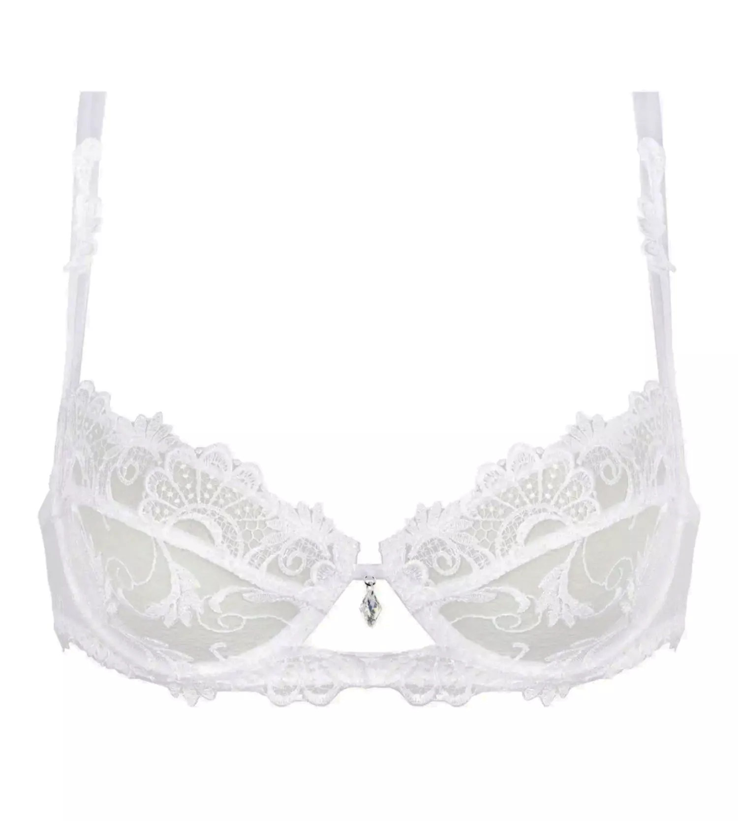 Soutien-gorge Dressing Floral haute couture Ă©gayĂ© d’un dessin spectaculaire rĂ©alisĂ© en point guipure sur de la lingerie tendance et Ă©lĂ©gante. Style chic d’inspiration Art DĂ©co tout en douceur et transparence, relevĂ© d’un bijou scintillant.