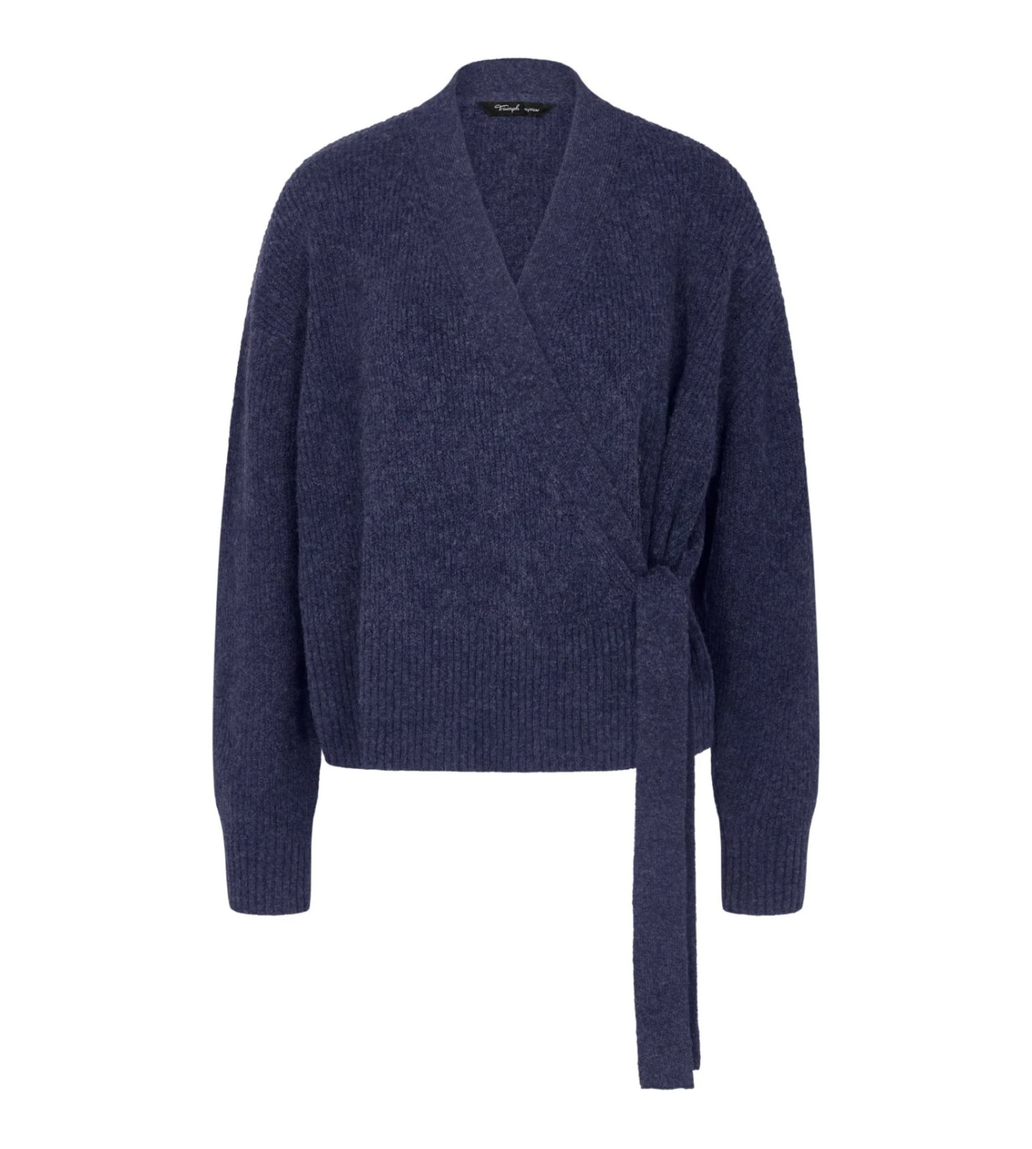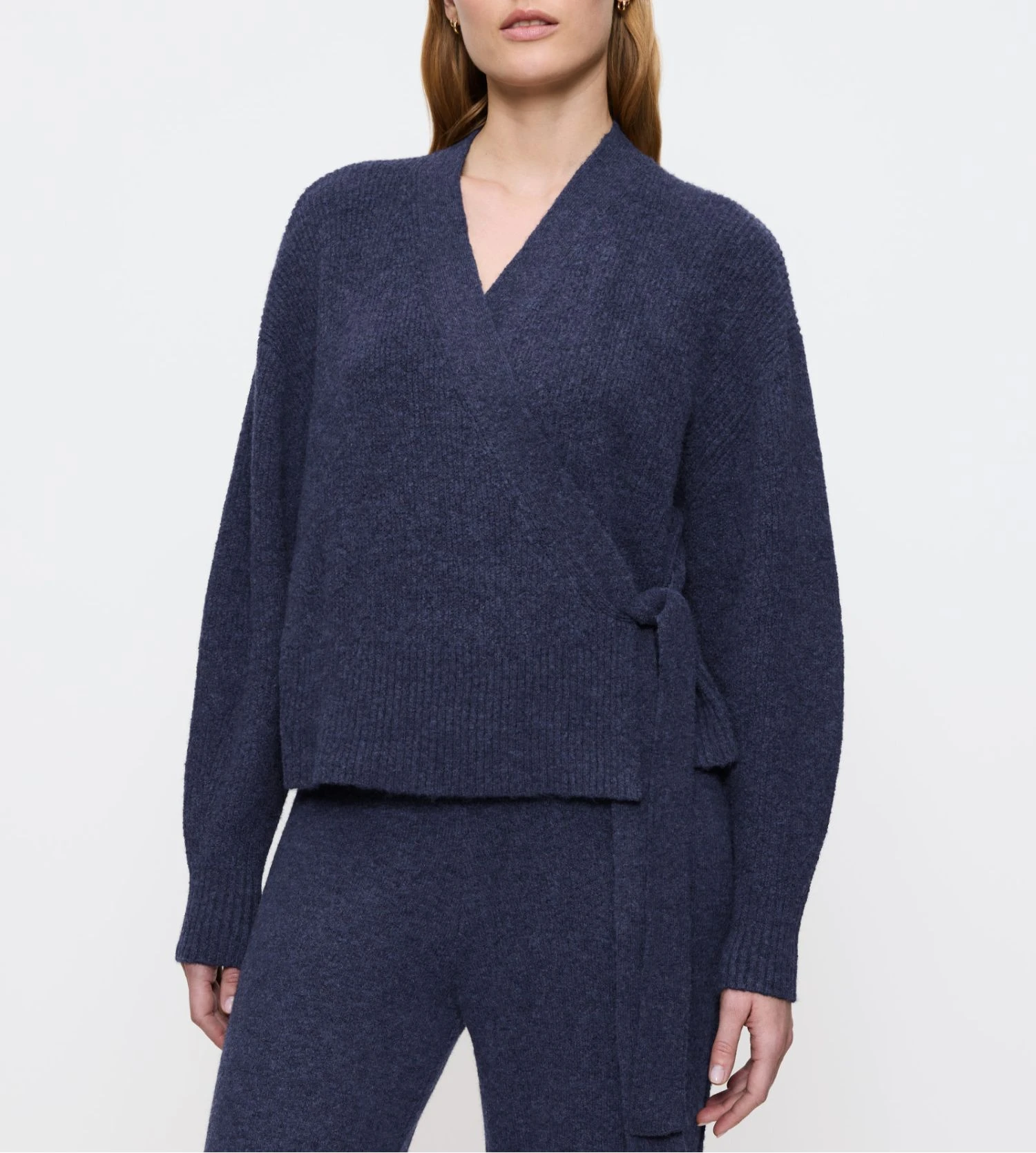 Ce modèle se distingue par sa teinte bleu foncé profonde et sa coupe cache-cœur intemporelle. Sa structure carrée aux épaules tombantes offre une liberté de mouvement totale, tandis que les poignets côtelés élégamment retroussés apportent une touche de sophistication. Les liens latéraux permettent de cintrer la taille selon vos envies pour sublimer l’encolure en V très féminine.