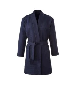 Ce peignoir de forme kimono se distingue par son coloris bleu marine profond et sa texture en nid d’abeille de belle facture, offrant un relief visuel moderne et une sensation tactile unique. Conçu en pur coton absorbant, il est l’alliĂ© idĂ©al pour vos sorties de bain, vos sĂ©ances de spa ou simplement pour vos moments de dĂ©tente quotidienne Ă la maison.