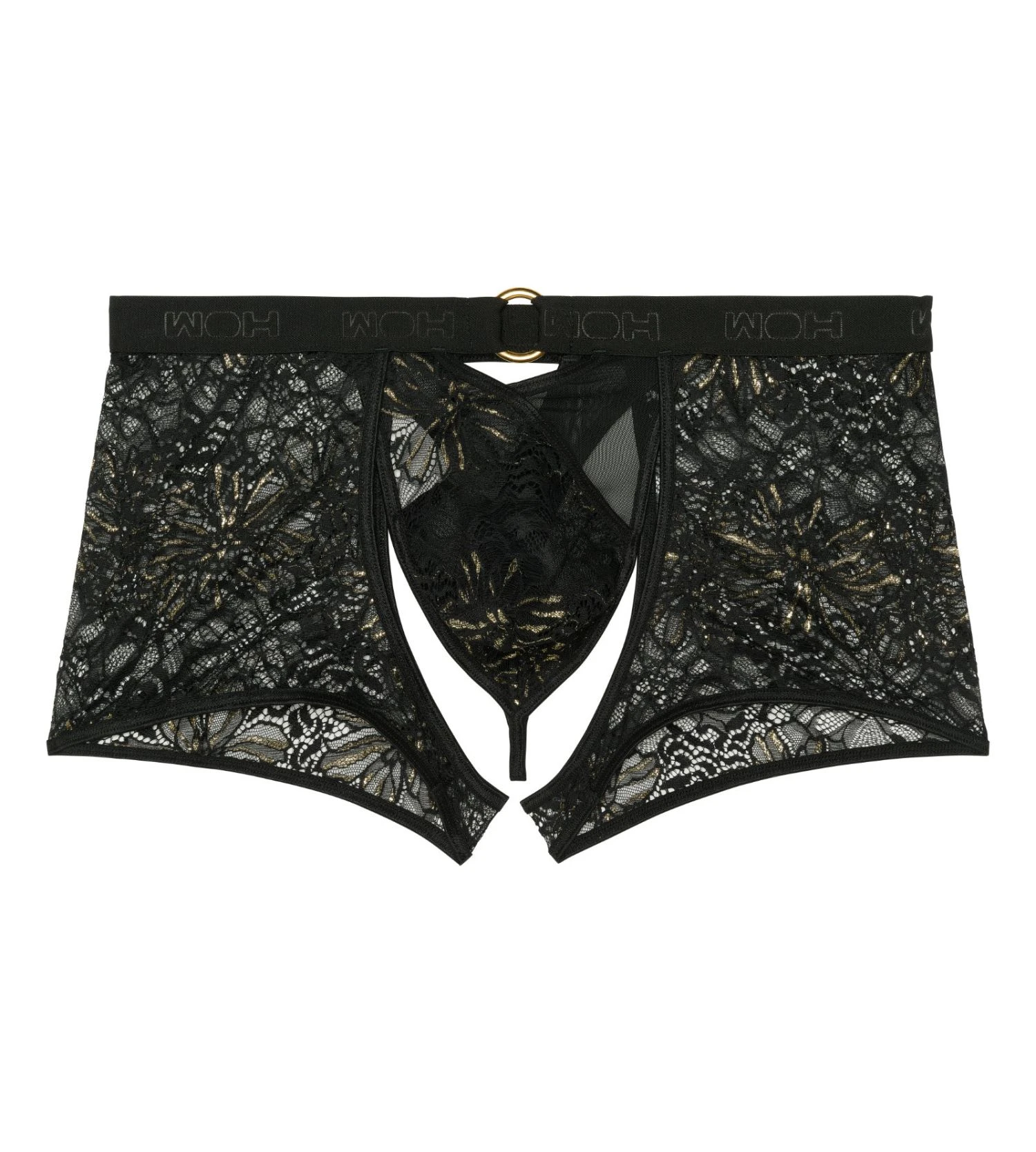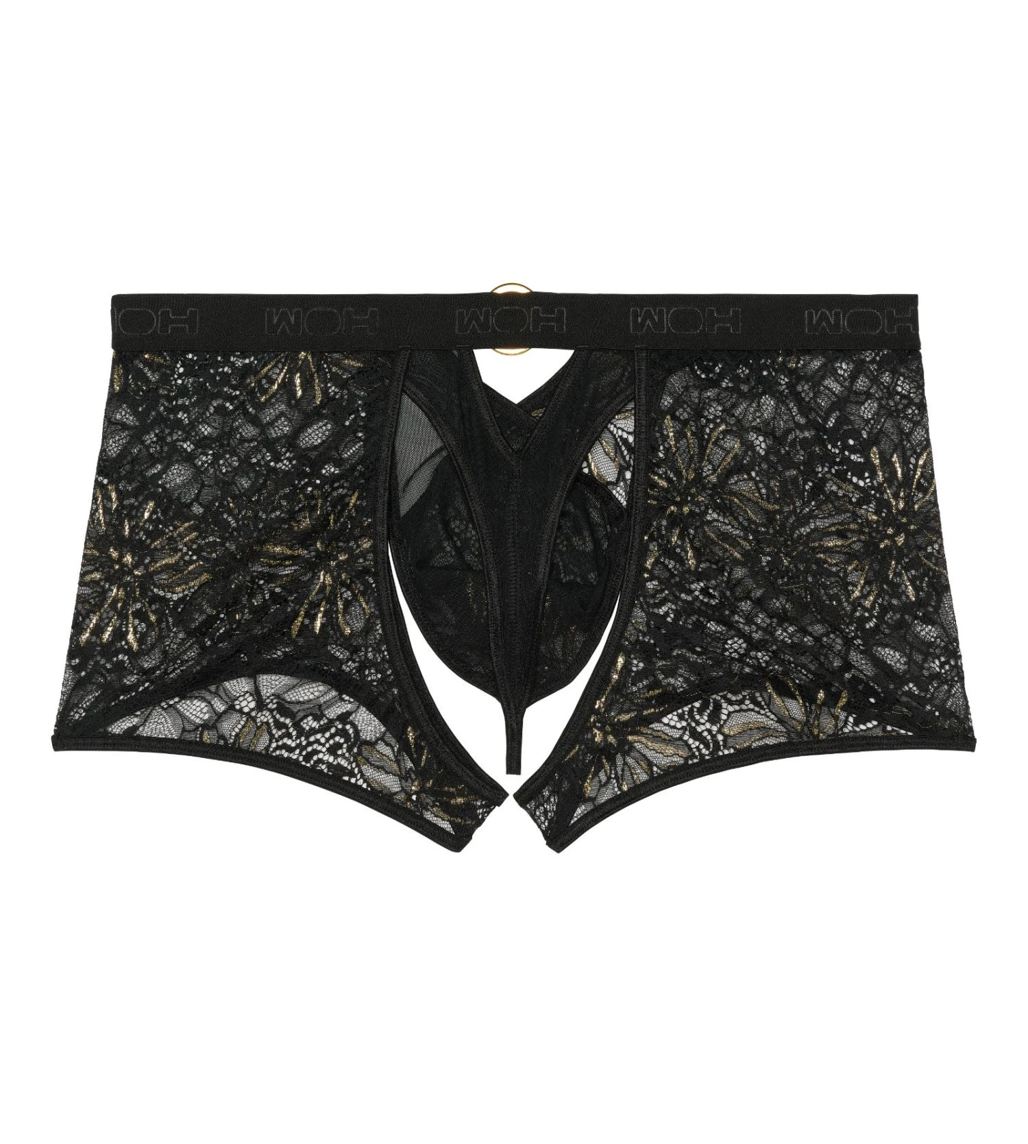 Crafted for impact, this boxer string features a stunning combination of intricate black floral lace and sheer tulle. The front pouch is designed with a unique crossed mesh overlay and anchored by a luxurious gold-tone ring that catches the light. Finished with the signature WOH logo on the elastic waistband, it offers a perfect balance of comfort and seductive style.